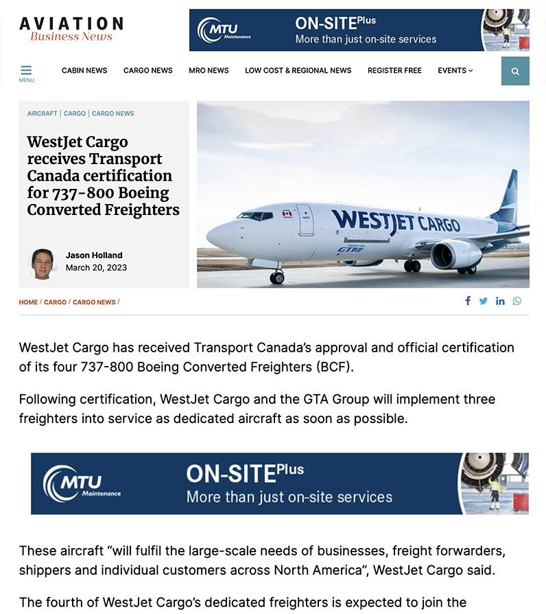 20 March 2023 READ THE ARTICLE WestJet Cargo receives Transport Canada certification for 737 -800 Boeing Converted Freighters