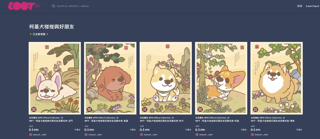後來,大約在一年前跟故宮博物院談到:像大英博物館、大都會博 物館等,開始拿它們的收藏品出來賣「數位典藏」,因為博物館只是代 為收藏這些文化遺產,並沒有真正的版權,作品一旦超過50年就會開放, 而故宮藏有這麼多超過百年以上的文物,我們建議院長,應該開放讓大家 使用,進行有趣的二創來發行NFT。在這個合作計畫「TAIWAN CONTENT ISLAND」,邀請許多臺灣知名IP一起進行二創,第一波的NFT以郎世寧 的《十駿犬圖》發行聯名NFT商品,當時首發推了5件商品,在第二波 則選了更多的畫作,其中定價最貴的,是故宮的鎮院之寶《谿山行旅圖》。 另外,在桃園的公共藝術合作專案,是由兩、三位藝術家合作,他 們將廢棄的路燈做成裝置藝術,除了實體的作品之外,另外一位藝術家 鳳梨三明治以數位程式,讓這件作品展現出完全不同的樣貌,再由我們 協助製作成NFT上架,「不管點哪裡,它會跟著滑鼠的方向轉,甚至有 特殊的互動的方式。」是這個作品最特別的部分,因為這是一種特殊的 格式,叫「p5.js」,目前應該只有我們公司、OpenSea、akaSwap,還 有Art blocks,以藝術品為主的NFT平台,才有辦法用這種格式來呈現。 《柯基犬椪椪與好朋友》 Lootex與故宮第一批以院藏品「清郎世寧畫十駿犬 軸」進行二創發行NFT,讓法鬥、貴賓、 柴犬、科基、博美化身為清代名犬,輔以插畫方式描繪山水,重新打造文創新潮流。 柯基犬 椪椪與好朋友 (圖文來源出處:Lootex官網,故宮精品 National Palace Museum Shop專區) 24
