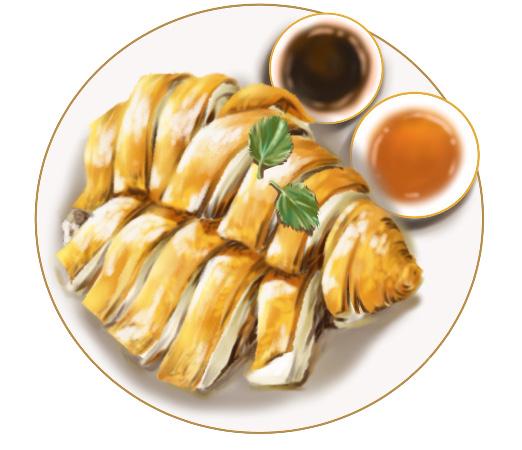 表示,她感受有別於平面創作的客家菜,不再侷限於紙張描繪下的動態圖片,比起照片更有溫度,會場 間也彷若飄來陣陣香氣,作品「客家白斬雞」更以客家著重的「四點金」融入創作,那是一張帶有「頭、