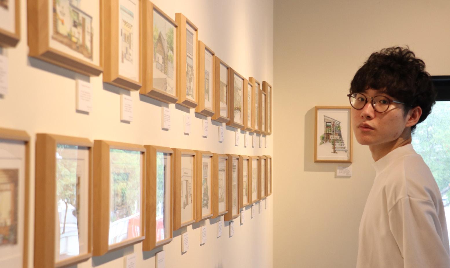 對他在途中所看到的風景、與踏訪旅行的過程, 又是另一種的收穫跟感動,「我一定要親自拜訪 過店家才會作畫,如果沒有拜訪過,或是沒有和 店家交流後,獲得彼此的認可的話,我想可能就 是緣分還沒到。」 以「善循環」為念, 打造一個:線下真實X線上虛擬=貴人製造機 聊起創作歷程,林靖博娓娓道出,因為從小 到大不斷被同學霸凌,養成了內向、邊緣的個性, 直到他遇到了生命貴人的咖啡館,將自己從人生 谷底拉起,彷彿打開了祕密通道的大門,四年多 來,他不斷地像一個祕密客到處踏訪,穿梭各地 的獨立咖啡館,從原本的12間咖啡館,累積出上 百幅的作品,直到疫情影響,讓他只能暫停咖啡 館行旅。 「在去年疫情稍微舒緩的時候和朋友去露 營,其中一位朋友在露營時還抱著電腦在忙,我 們就問你在幹嘛?」在那天,林靖博第一次接觸 「NFT」這個陌生詞彙,他看著對方的螢幕畫面, 從鑄造到上架,不到30秒就聽到「賣完了!」 不需要辛苦找地方展售,連買家都沒見過就瞬間 秒殺!這讓林靖博心中萌生:「我有這麼多的作 品,是不是也能夠變成NFT?」為了這場《築構 之間》展覽,他心中開始思索,「NFT是不是能 夠支撐這一部分的開銷?」開啟林靖博NFT新領 域的朋友,與他分享一個臺灣人創辦的NFT平台