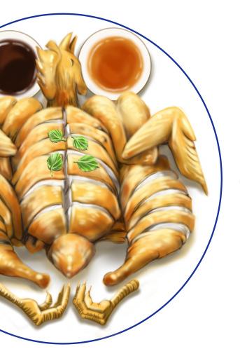 我想來點 …… 吃的。 今晚, 客家 菜 NFT 客家白斬雞A. 1. 放山土雞一隻,脖子下方要開孔(完整全雞,不可以剁開) 2. 薑片、鹽、米酒 3. 兩鍋水(一鍋汆燙、一鍋煮) 4. 電風扇 材料 1. 將雞腳反折塞入雞腹。 用汆燙鍋的水汆燙全雞,以去除血水、使腹腔與雞身均溫,汆燙完畢撈起。 2. 煮鍋放入全雞後,倒入冷水恰好淹過雞,水中可以加入少許鹽、少許薑片。 3. 上蓋大火煮到水開,立即轉小火煮8~10分鐘。關火後再燜10分鐘。 4. 用筷子在最厚的部位試刺,能輕易穿刺而且抽出後沒有血水就代表熟了, 如果沒熟再上蓋繼續燜,不用開火。(時間依照雞的大小決定)。 5. 用長筷撐起翅膀下緣起鍋,全雞趁熱抹上米酒與鹽。 6. 倒掛靜置,用電風扇吹涼一小時後進行剁雞。 7. 擺盤最關鍵:先剁頭、爪,頭擺放在盤子的最前端,爪擺最後端,再剁鳳尾、 翅(四點金),剁下雞腿片塊擺好之後,再將雞身直切對半,先取下雞胸白肉, 骨架剁成三四片,和尾椎擺盤底,雞背剁塊放在雞脖子左右兩側(左右半部重 複動作),雞胸肉大塊片開後,覆蓋在邊角料上。 四點金必須要完整的在白斬雞菜盤上才可以。 作法 價格|USD$00.0(NT$0,000) 限量|1份 發布時間|2022-00-00 開賣倒數| 0 Hr 0 Min 尚未開賣 56