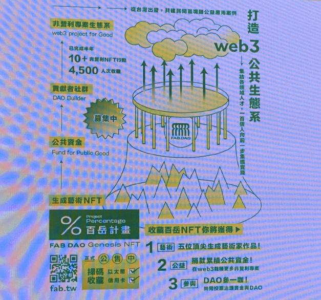 推動生成藝術計畫, 打造Web3.0公共生態系。 FAB DAO(全名Formosa Art Bank DAO) 1 目前正在推動的「百岳計畫%」,由黃 豆泥向我和其他五位臺灣的生成藝術家(吳哲宇、林逸文、王連晟、林經堯、黃新), 提出以臺灣的山岳為主題,共同製作的生成藝術計畫。這是一個很困難的挑戰,從原本 主流能接受的最大版數是1000版提高到2000版,會涉及用程式去運算的多樣性與重複 性的結果,因為生成藝術的算法有一套規則,在這個規則內,可以讓藝術家自由發揮, 生成具備藝術家獨特理念的作品;我們希望能夠藉由這項計畫,來推廣加密貨幣與NFT 的慈善運用,一起打造Web3.0公共生態系,從生成藝術NFT募集公共資金,讓各領域 的人才聚集形成貢獻者社群,達成真正去中心化的公益團體。同時,最終的目標,是想 要打造經得起時間考驗的生成藝術。 七、Art Basel HK 2022 今年5月份在香港巴塞爾藝術展,以「NFT+不斷發展的藝術世界」 為主題的展覽,展場結合數位平台和實體展品,還有一個「衛星專區」, 讓不能到場的畫廊能遠距參與,疫情之下,加入「數位」的藝術市場反 而更加熱絡,改變了要在實體藝廊展出,藏家必須親自到藝廊現場挑選 作品的舊有模式,就算遠在國外的藏家,只要對作品有興趣,他們就能 透過NFT平台下單,而區塊鏈上的NFT歷程,也能確認作品的真偽, 連售出的作品保證書都能透過區塊鏈的錢包寄送給藏家。 FAB DAO與臺灣5位生成藝術家合作,進行「百岳計畫%」,冀期打造 Web3.0公共生態系,成為真正去中心化的數位公益慈善社群。 註1:FAB DAO,全名 Formosa Art Bank DAO (福爾摩沙藝術銀行 DAO),為公益NFT自治 組織,集結跨域組織與個人,致力於開創臺灣NFT結合公益、藝術、文化的新篇章。 跨世代轉身 19