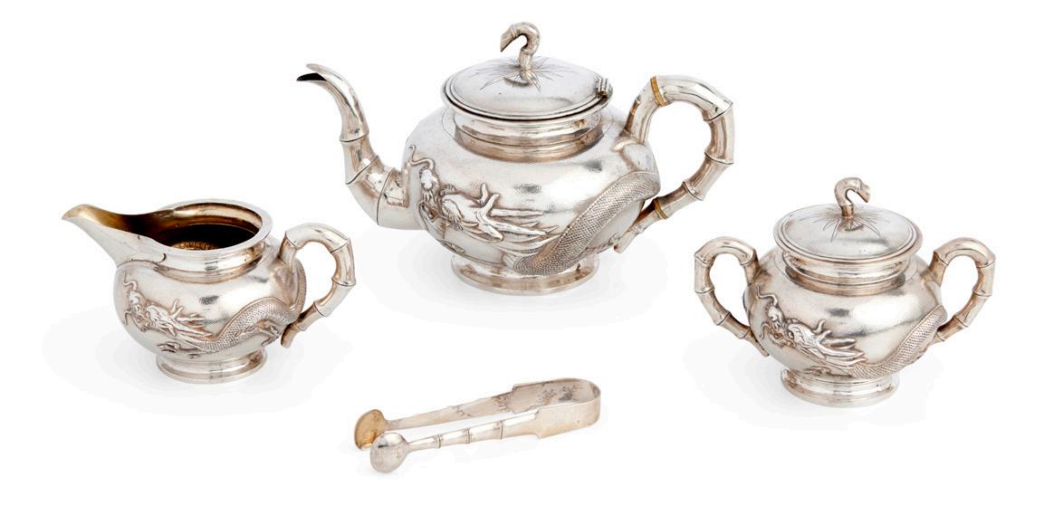 Comprising a teapot, cream jug, sugar bowl and sugar tongs, each well decorated with a writhing dragon against a finely hand-beaten ground and with gold-wash interior, each marked ‘TUCK CHANG’ and together with the original fitted camphor-wood box. 1140 grams.