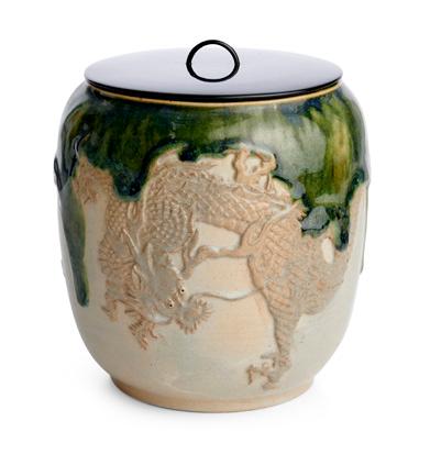 Modelled in high relief with a pair of demonic warriors in the form of bird headed men, covered in a celadon glaze, with iron-wash to the faces and shields. Mounted on a black stand.