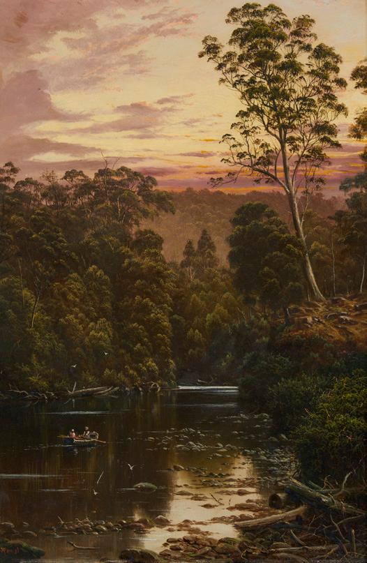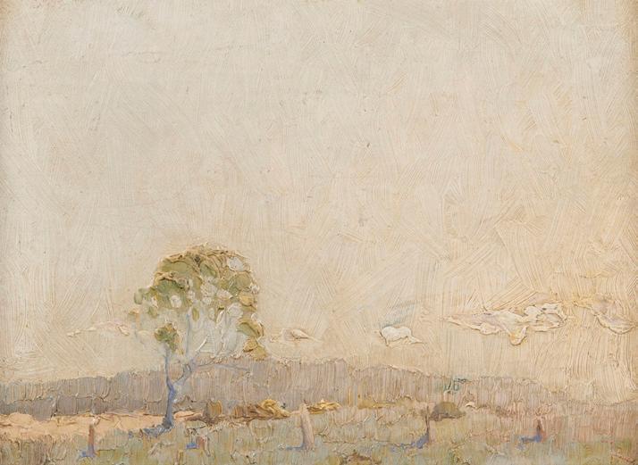 In the first half of his career McCubbin’s practice had a more academic approach, he typically used small, meticulously applied brushstrokes to create realistic depictions of events entwined with national identity on large scale canvas’. These works presented a way of life unique to Australia and captured the spirit of the bush, his view was of the new settler and someone not yet at home in Australia.7 Following McCubbin’s travels abroad and by the time he begins the later phase of his career his approach and methodology to painting has evolved into a matured style, content with both his surroundings in the Australian landscape and himself as a painter. With a focus on atmospheric painting and a freedom of expression, McCubbin’s evocative later works express his delight and comfort within the Australian landscape.8 This transition in McCubbin’s career in many ways was aligned with the evolution of the nation, his later paintings tell us that Australia is no longer a place of pioneers down on their luck, it has modern and established cities where society prospers.9