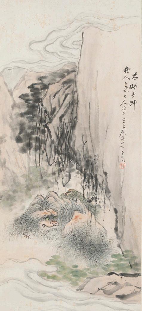 Hanging scroll, ink and colour on paper, inscribed, signed and three red seals of the artists. 122 x 31.5cm
