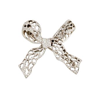 The openwork bow motif of finely pierced fluttering ribbon, pavé-set throughout with brilliant-cut diamonds together weighing approximately 3.00 carats, with a brooch pin and a clasp swap fitting, signed Paspaley, length 42mm, width 41mm.
