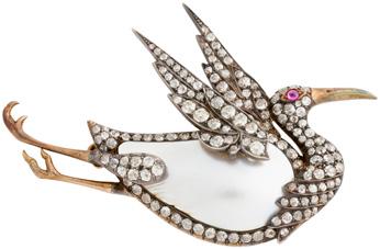 Case: polished round, millegrain-set diamond bezel, suspended from a pave diamond-set bar brooch, hinged case back numbered 223111