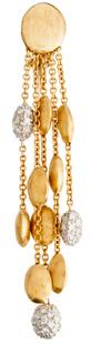 Each diamond-set half hoop surmount supporting a trace chain mesh basket collet-set at intervals with circular opals, together weighing approximately 0.85 carats, holding a detachable undrilled 13.65 to 13.77mm round cultured pearl, further supporting a 5.00mm keshi pearl swing drop, post and clip fittings, signed Paspaley, pendants detachable, length 43mm.
