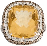The rectangular rose cut lemon quartz weighing approximately 21.75 carats framed by brilliant-cut diamonds together weighing approximately 0.81 carats, signed Hubert, size P.