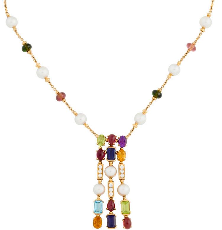 The flexible mesh collier centring a detachable spring loaded pendant clasp swap designed as a bezel-set rose quartz cut en cabochon, framed by a border of pavé-set diamonds, connected by a brilliant-cut diamond of approximately 0.30 carat weight to an 18.00mm cultured pearl pendant drop, unsigned, pendant swap length 43mm, inner circumference 430mm.