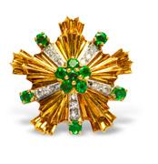 Each modelled as a starburst, claw-set to the centre with circular-cut emeralds framed at intervals with lines of pavé-set diamonds terminating in claw-set emeralds between undulating fluted rays, mounted in 18ct gold, diameter 23mm, clip fittings, numbered, signed Tiffany & Co.