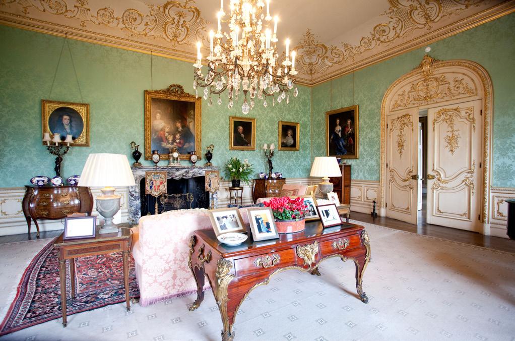 The drawing room is decorated in the opulence of the Rococo revival style, featuring French green silk wall hangings, inspired by those in the Palace of Versailles. A notable portrait in the room is by Sir William Beechey, depicting the children of the first Earl of Carnarvon, above the mantelpiece.