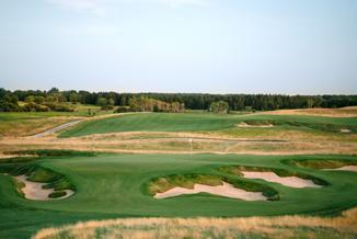 dives toward a green protected by a massive bunker on the right side and a bunker and a pond on the left. “We wanted players to have a route to roll their tee shots onto the green,” said Lohmann. “The water on the left side combined with the bunkers make that task more difficult. But the severe downslope of the fairway gives a good tee shot a decent chance for a birdie or maybe an eagle.” Even if that tee shot is executed flawlessly, birdie on this hole is no cinch as the green was enlarged and allows for a number of treacherous flagstick locations.