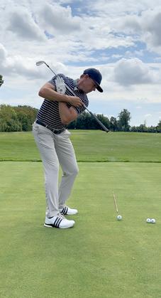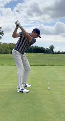 Step 3: The hips and shoulders need to work approximately 90 degrees around the spine. Since our posture puts us in a bent over position, our trail side will be higher than the lead side in the backswing. To achieve this feeling, place a club across your shoulders and practice feeling your shoulders rotating 90 degrees around your spine angle. Now, set up to a ball with the club across your chest and pair this motion with standing close enough to the ball that your trail hip back and up and your shoulders work around your spine. This combination is an absolute game changer in providing enough space for the club to return to the ball.