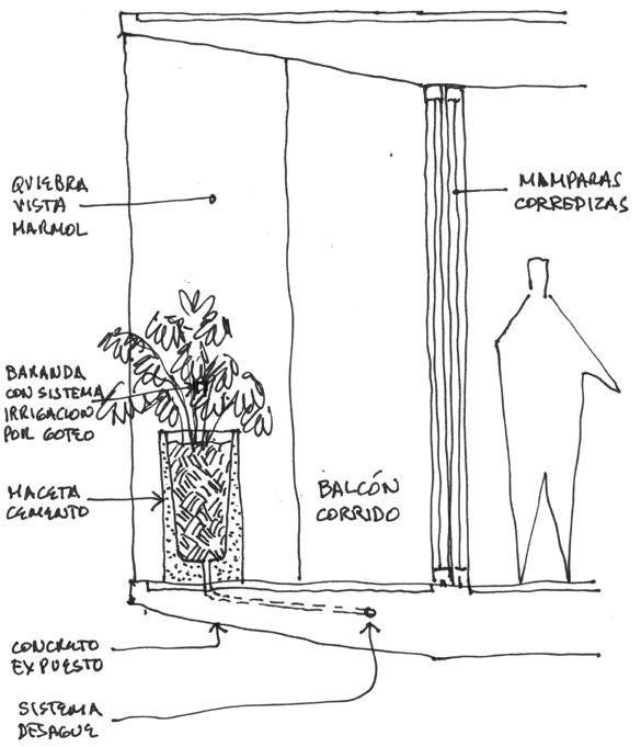 di città, dotata di una larghezza di circa 25 metri. Con la sua doppia corsia a senso unico in entrambe le direzioni, le ampie aiole alberate sui due lati e i generosi marciapiedi, questa strada sviluppa un importante volume di traffico sia veicolare sia pedonale. La facciata, piuttosto irraggiata per via dell’esposizione a nord, risulta più serrata rispetto agli altri due fronti proprio per esigenze di controllo della temperatura e di abbattimento dell’intenso rumore veicolare. Molto interessante risulta il sistema di aggetto dei balconi a giorno sull’angolo e dei bow-windows sporgenti che, contenuti entro il filo della facciata, riducono progressivamente la loro profondità per effetto della svasatura del piano del muro, che si va raccordando sul limite del lotto adiacente. Sul lato meridionale, che dal punto di vista del funzionamento della luce solare corrisponde al nostro nord, la vista della facciata corta dell’edificio, piuttosto trasparente, spazia sulla vegetazione lussureggiante del Parque Naciones Unidas. Anche in questo caso il balcone rigira a giorno sull’angolo, per poi allargarsi in una generosa terrazza e, successivamente, riprendere la stessa profondità del lato opposto. Molto elegante appare la soluzione di attacco dell’aggetto al fronte cieco della parcella che viene risolto con un giunto cavo. In questo caso, data l’esposizione meno soleggiata, prevale la trasparenza per la necessità di aprire la zona giorno della casa verso la splendida vegetazione del parco antistante, non gigantesco ma abbastanza ampio da garantire una completa privacy. Sul lato orientale, la grande facciata lunga è aperta sul piccolo tronco di collegamento tra l’avenida e il parco. Pur essendo un breve tronco di raccordo, questa superficie ha la stessa larghezza della strada principale e contiene un generoso parcheggio. In questo caso la soluzione dell’alzato assume un carattere quasi monumentale, pur rispondendo a problemi di natura piuttosto pratica come la necessità di schermare la luce solare e garantire la giusta privacy alle camere da letto di entrambi gli appartamenti posizionate su questo lato. Questo senso di grandiosità, tuttavia, è ottenuto grazie a dispositivi molto semplici come la leggera convessità data dalla convergenza delle due porzioni della facciata rispetto al suo punto di mezzeria o come la serrata teoria di elementi frangi-sole e frangi-vista a sezione triangolare in marmo locale. L’idea complessiva di un esteso e raffinato giardino pensile, in continuità con la