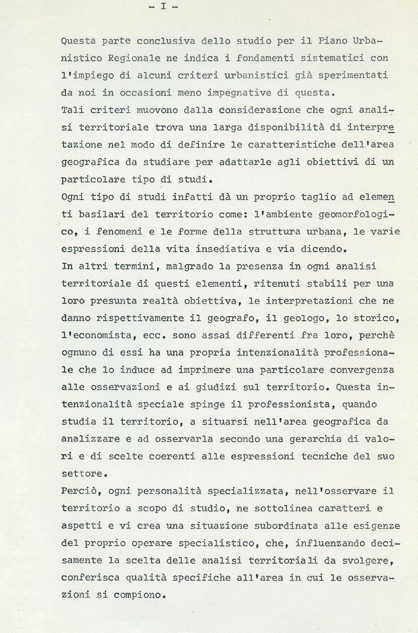 La pianificazione urbanistica è pertanto pensata come un problema di rapporto tra diverse unità urbane e le aree di territorio esterne a esse, non secondo un’astratta “isotropia” che mira a dissolverne le distinzioni teorizzando uno sviluppo direzionato dalla presenza o istituzione di numerosi poli qualitativamente e quantitativamente omogenei, ma, al contrario, attraverso la concreta misurazione dei «segni emergenti» di una configurazione territoriale che, precisano Samonà e Polesello, «trova in tali segni le ragioni valide per motivare […] il senso del suo futuro sviluppo»44.
