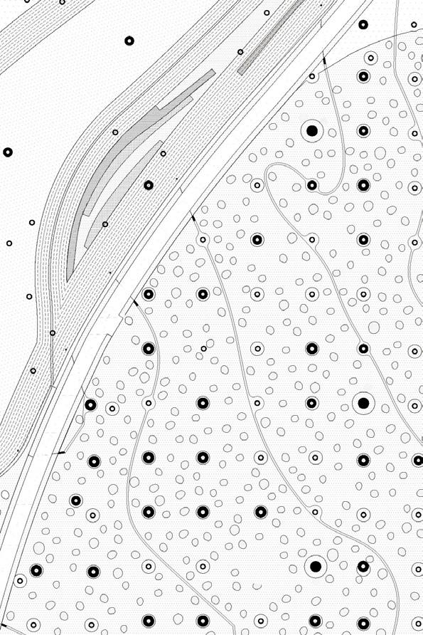 Esse appaiono sia come forme specifiche e memorabili, sia come forme generali quando si riferiscono alla forma del paesaggio più ampio, più territoriale. Raccontami come identifichi le tracce nel progetto? Le costruisci dall’osservazione diretta del luogo? Oppure emergono durante l’elaborazione? Svolgono un ruolo principale o sono il risultato di altre decisioni, di altri principi? Mi sembra che la tua ricerca riveli tracce che a volte sono ritrovamenti nel terreno, ma non è archeologia, è qualcosa di diverso. Il tuo rivelare tracce è un modo per studiare e raccontare il tempo, gli agenti atmosferici, la geologia, le immagini di elementi naturali che si trovano nel paesaggio. Insomma rappresenti e costruisci esperienze e le porti a divenire reali, ad esistere come uniche. Sembra quasi che tu abbia con te una libreria di cose: una biblioteca della vita, di figure viventi che, proprio come nei romanzi, diventano personaggi speciali. Phase Shift Park, Taichung, Taïwan, 2011-2019. Dettaglio della planimetria generale.