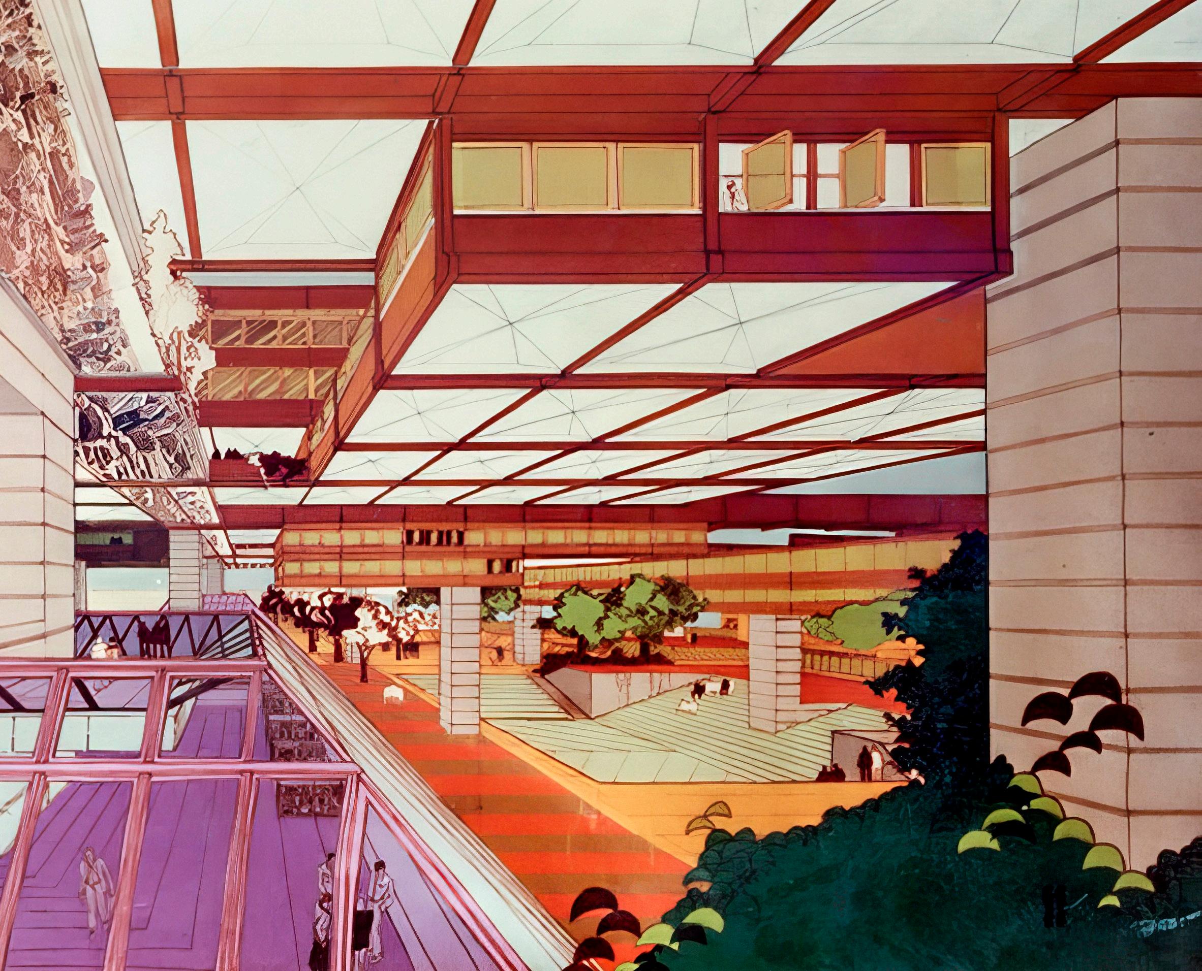 Wright aveva dimostrato la capacità e possibilità di neo organismo nella dimensione del domestico, l’aveva dimostrata nella dimensione della scala in termini di funzioni (quindi il contrario della pianificazione razionalista) ma non aveva affrontato, o non poteva affrontare, il tema globale, cioè che la geometria della tesi organica doveva conformare l’intero habitat dell’uomo sulla Terra per ridargli il diritto di essere degno e non oppressivo ospite.