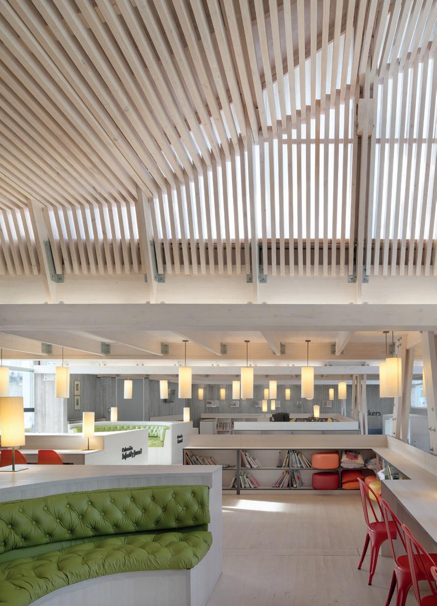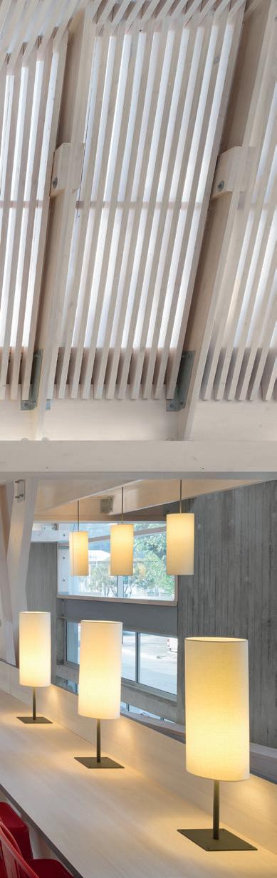 Para fortalecer el carácter interior de estos dos patios, sus caras están flanqueadas en madera. Este universo íntimo o “blando” se contrasta fuertemente con una fachada exterior en acero que, junto con diferenciarse por color y temperatura con el interior, es capaz de recoger en su pátina el paso del tiempo en su superficie, tal como lo hacen las tejas de arcilla.