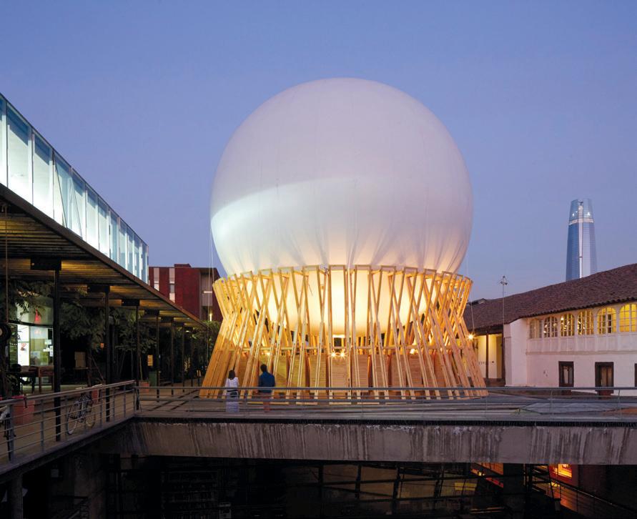 La cubierta de la argolla de madera se realizó con una esfera inflable de PVC de 12 metros de diámetro que, junto con cubrir e iluminar el espacio, actúa como un símbolo que anuncia el pabellón desde la lejanía. Respecto al carácter simbólico de la propuesta, la forma circular recuerda solemnemente el sentido de comunidad forjado durante los primeros 120 años de existencia de la Escuela de Arquitectura. Esta es una referencia explícita a la larga tradición de construir monumentos mediante formas platónicas.