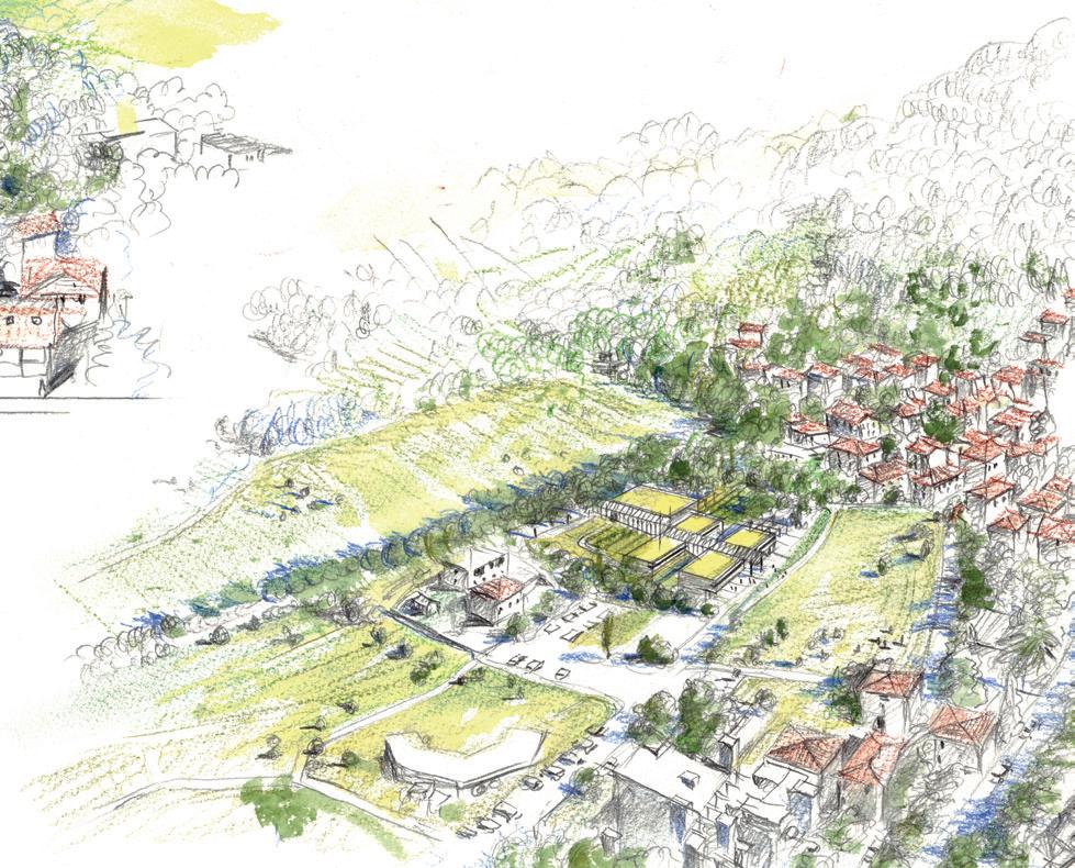 la posizione – sintetizzando in un unico complesso funzioni diverse (amministrative, culturali e assistenziali) rendendo l’insieme facilmente accessibile da varie direzioni salvaguardando, allo stesso tempo, la particolare natura del luogo. Un insieme funzionale sintetizzato nell’embrione di una forma urbana, articolato in un sistema radiocentrico di vie e di edifici disseminati lungo il pendio”. (L’Arca, 39, 1990).