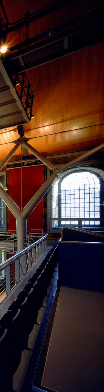 This competition-winning commission transformed this Grade II listed building into a 750-seat concert hall and multi-purpose public building. The scheme enables the performance space to convert rapidly from a fully seated to flat floor layout, and the acoustics can be varied to suit different requirements. A new ‘over-roof’ structure, supported by external columns, provides space for services and additional acoustic volume and retractable absorption panels. The design also allows for the future addition of a 200-seat and 500-seat auditoria for dance and drama.