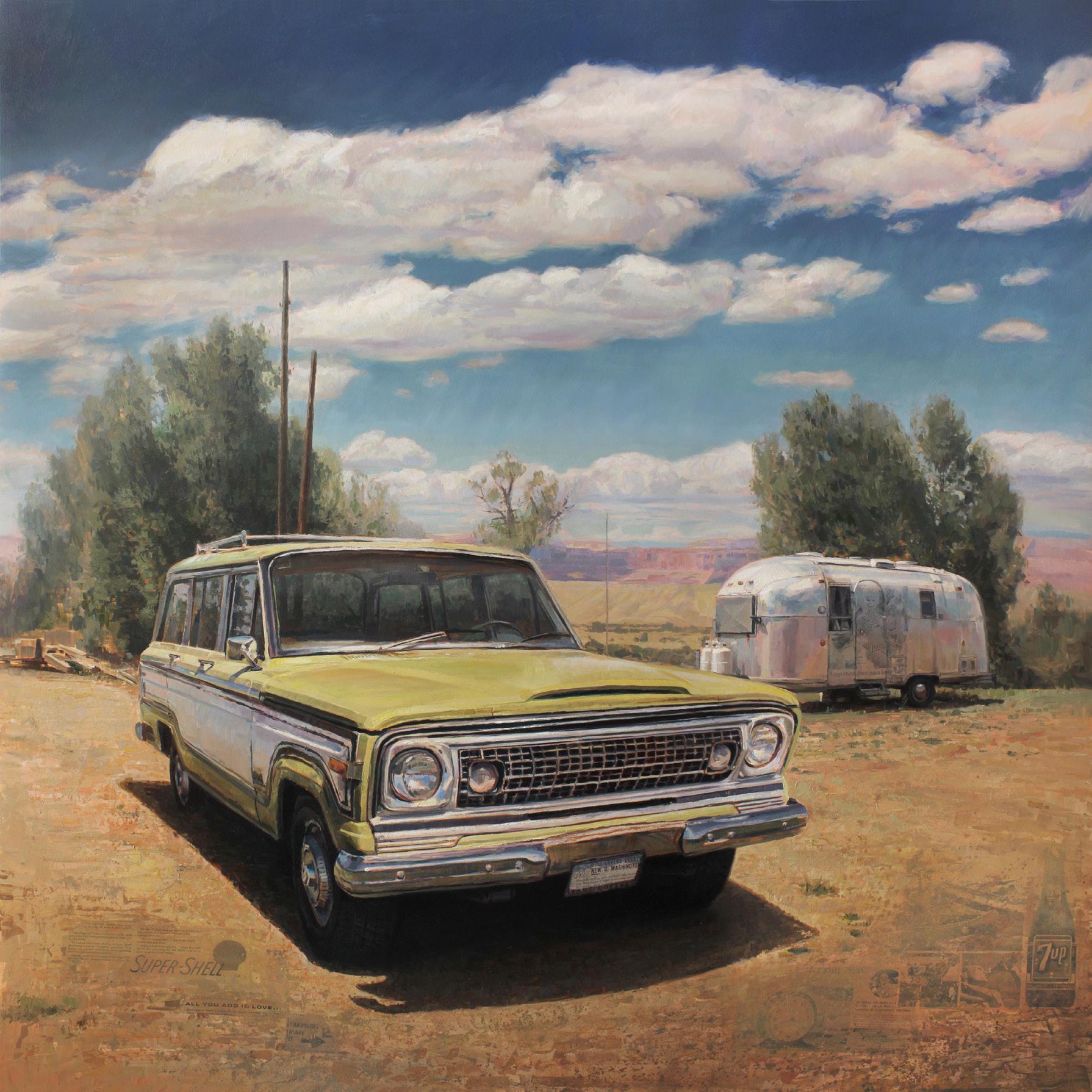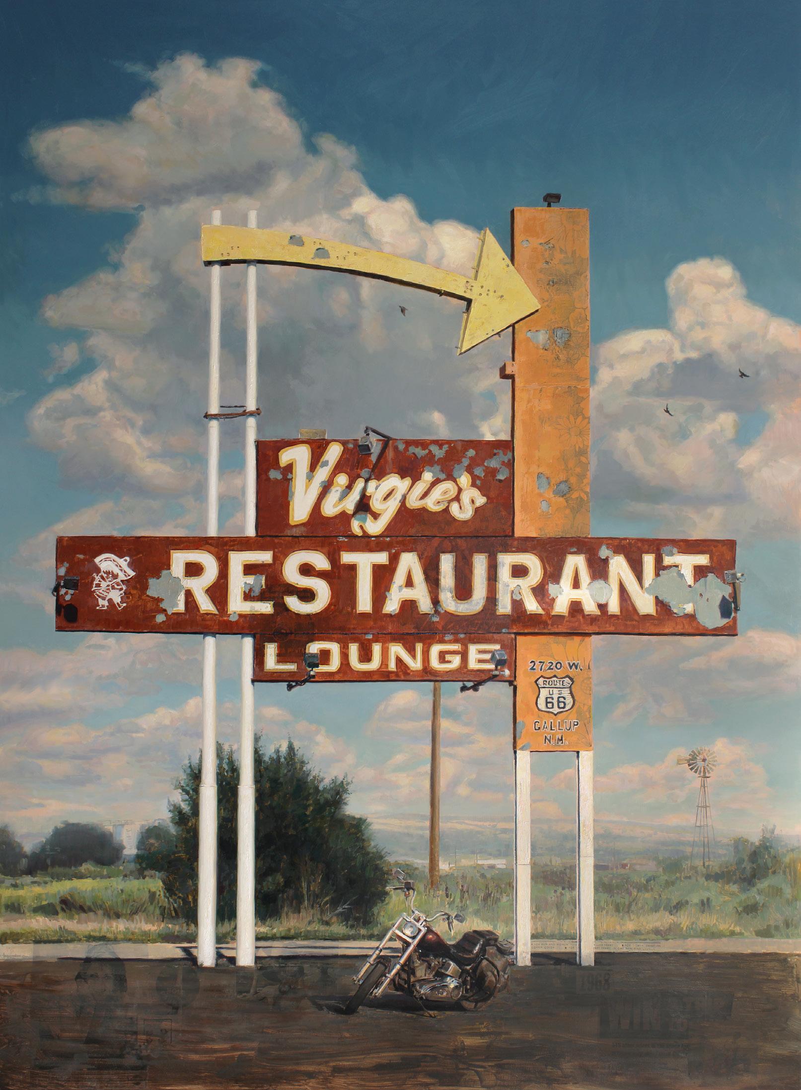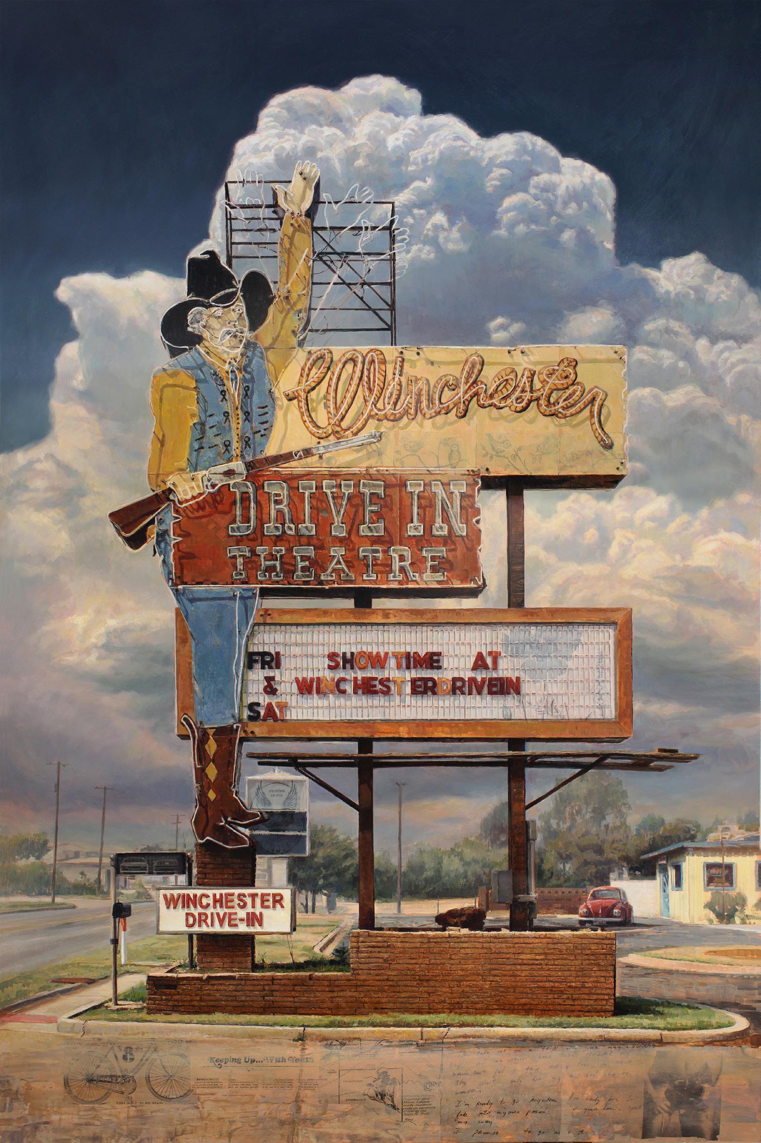 These specters of Americana drift across the canvas: the skeletal remains of a gas station; the sun-bleached marquee of a long-closed theater, its missing letters like a puzzle to the past; the quiet dignity of a rusting pickup silhouetted against the mountains at sunset, bathed in the warm scent of dust and sage. Faded numbers linger on weatherworn signs—whispers of another era, when the world moved more slowly and each dollar stretched a lot farther. Kowalski’s brush finds the humanity in each of these places and objects, offering a kind of portraiture of the past that is both deeply personal and universally recognizable. Viewers are drawn in not only