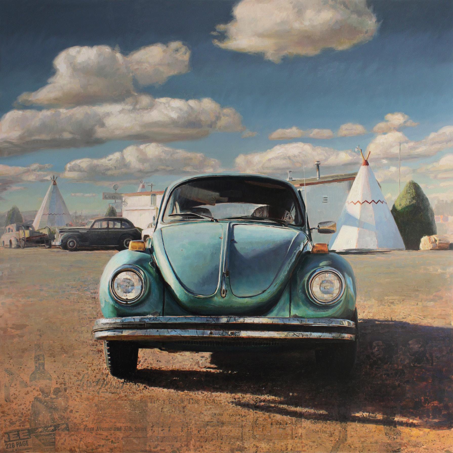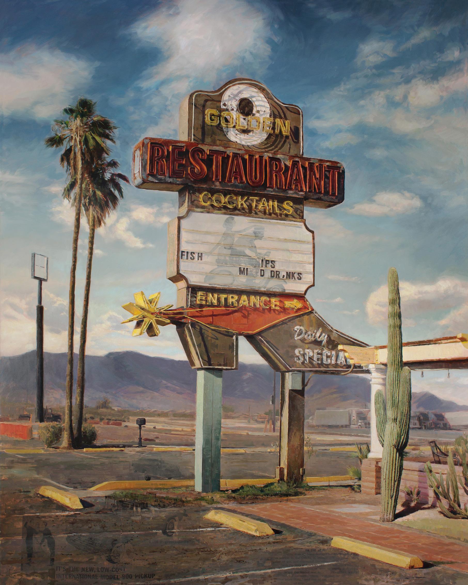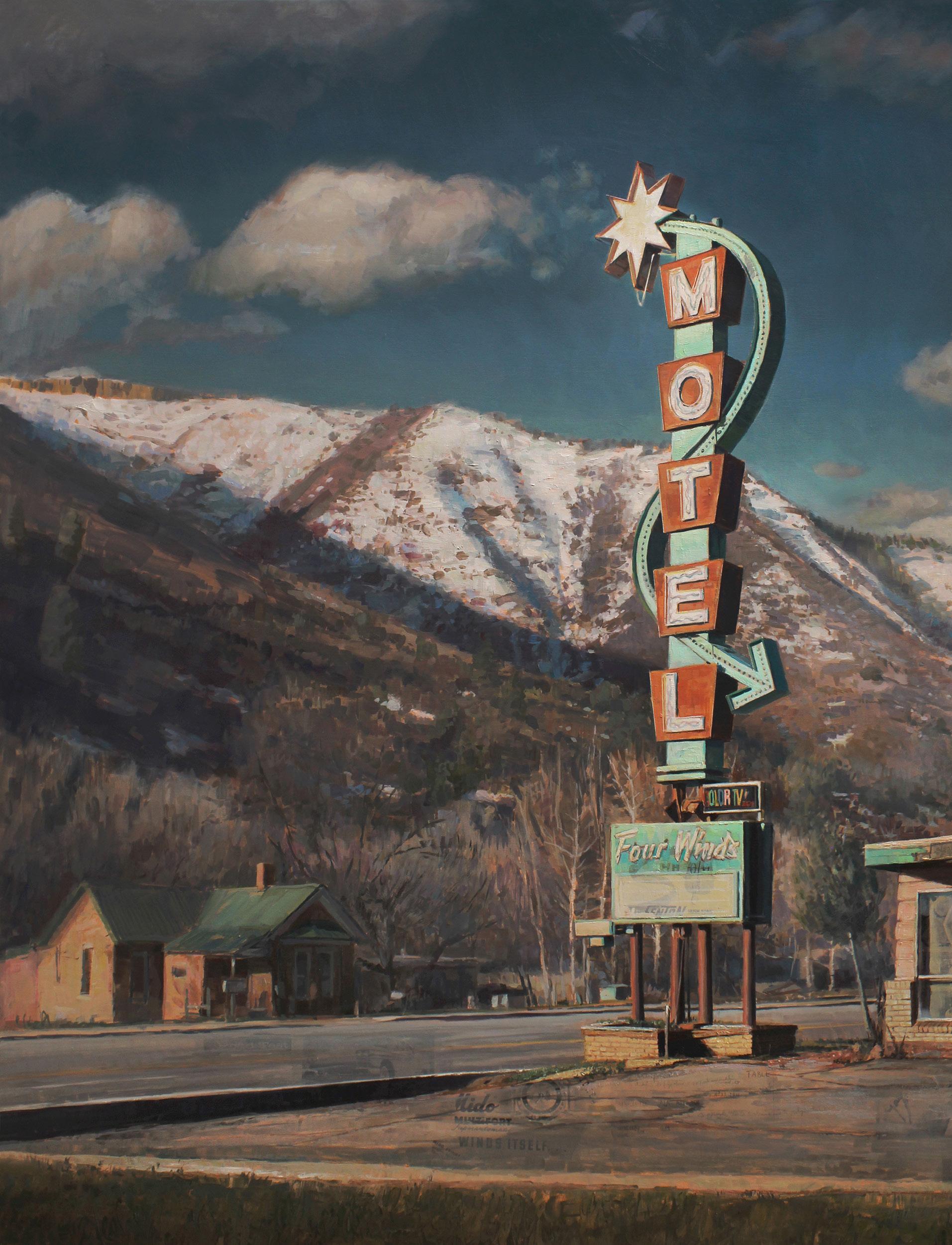 Jason Kowalski is one of the most compelling contemporary realists working today. Known for his richly detailed portrayals of America’s aging roadside architecture, signage, and longforgotten places, Kowalski captures the quiet poetry of structures shaped by time. In Western Stars, he merges meticulous technique, narrative memory, and embedded ephemera to preserve the beauty of transformation and resilience in the American West. Rather than presenting his subjects as relics of a lost era, Kowalski reanimates them as survivors—faded yet luminous in the aura of memory, standing under the vast Western sky.