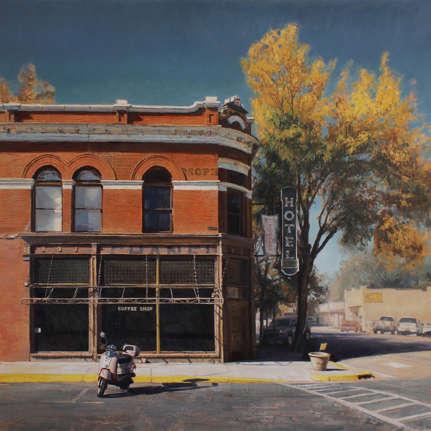 Many works in the exhibition are rooted in moments of personal connection. A particularly poignant example is Hometown Haven, depicting a small-town café in Florence, Colorado. Kowalski recalls the exact moment he first saw the building: “My wife and I were visiting the town, popping in and out of local antique shops. My young son, tired of walking, sat upon my shoulders as we crossed the road. It was such a happy family memory. I knew it would be an interesting painting.” The resulting work is not merely an architectural study but an evocation of warmth, conversation, and shared experience—an intimate moment woven into the fabric of place.