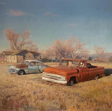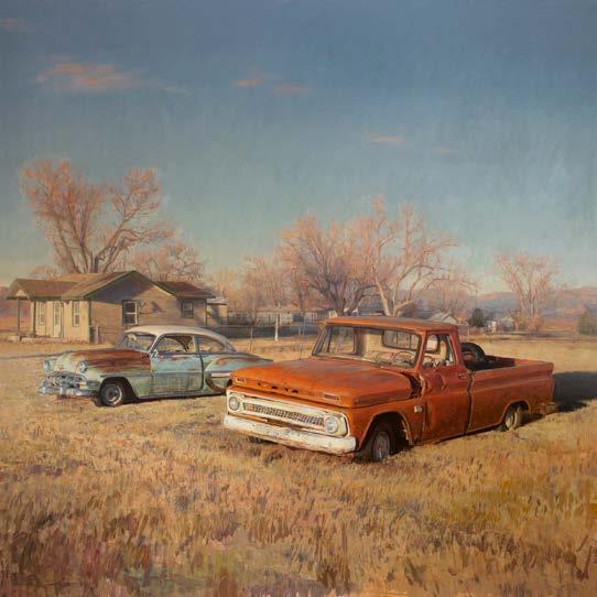 But Kowalski’s work isn’t all just motels that evoke the spirit of nostalgia of Old Route 66 and all the journeys it holds in its memory. In the LewAllen exhibit, Heritage Traveler, the automobile is a subject of equal weight. In Neighborly Nostalgia (2023), two vehicles sit, a car and truck, possibly abandoned in a field, although the field looks tended. But he treats them in the same way as he would a motel or motel parking lot,