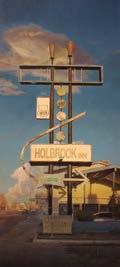 I don’t know if the Holbrook Inn, which artist Jason Kowalski captured in his oil and mixed media painting Glimpse of Greatness (2023), still stands or is even still in operation. Nor do I know the extent of Kowalski’s artistic license in his depiction of the inn as it is (or was). Its top sign is an empty frame and in the