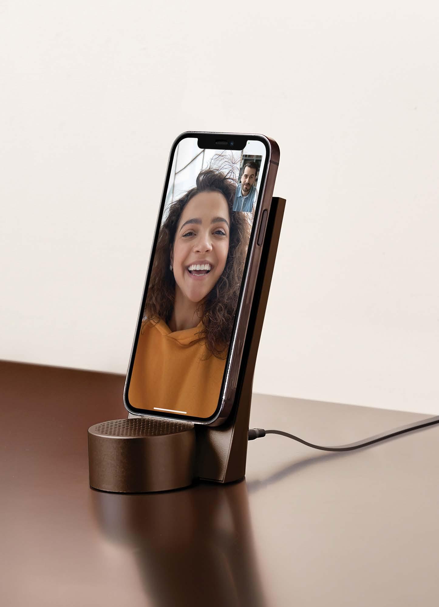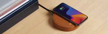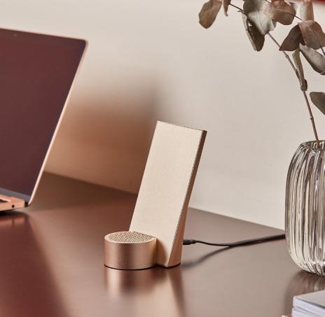 Wirelessly rechargeable Bluetooth® speaker - Pairable - Hands-free mic - Selfie control - Battery life: 3h - Charging time: 1h - Rechargeable via USB-C (cable included) or wirelessly. Material: Aluminum - ABS.