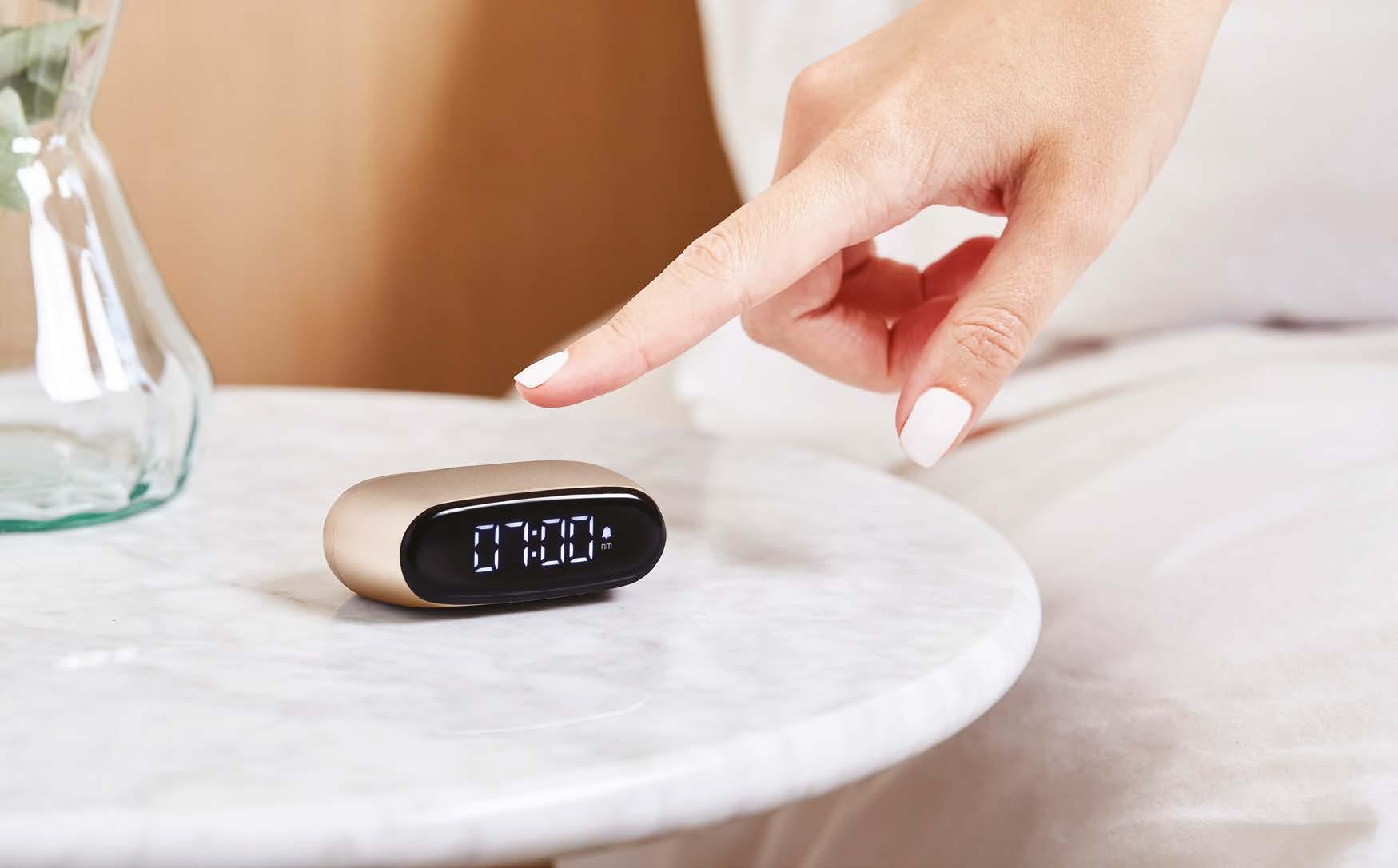 Mini réveil réversible de voyage - Faces ON/OFF - Ecran LCD - 3 niveaux de luminosité - Touchez pour répéter l’alarme & l’éclairage - Autonomie : jusqu’à 6 mois - Temps de charge : 2h - Rechargeable par USB-C (cable inclus). Matériaux: ABS