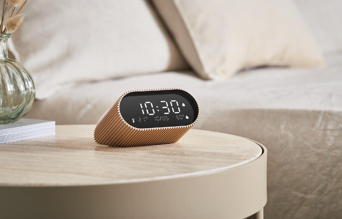 Radio alarm clock with FM & built-in Bluetooth® speaker- Dual alarm with FM radio or melodies & natural sounds - Large LCD display - Adjustable brightness - Indoor temperature and relative humidity display - Touch controls for easy access to Bluetooth/FM radio modes and device settingsRechargeable - Powered by USB-C (cable included) - Material: Aluminum - ABS. Suggested branding: laser - pad print.