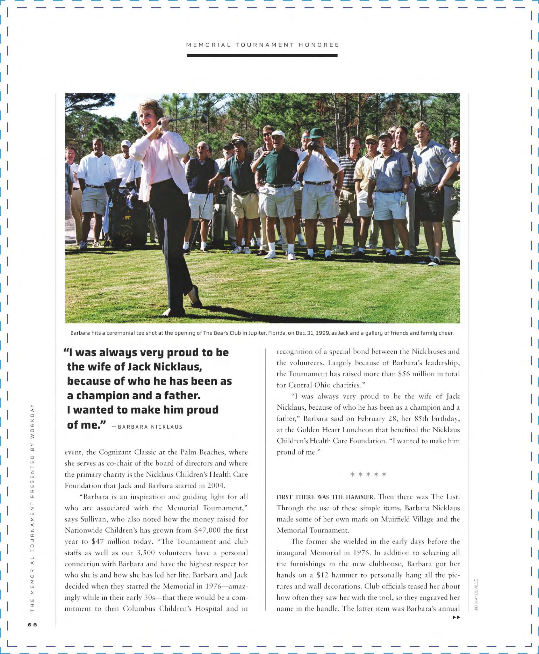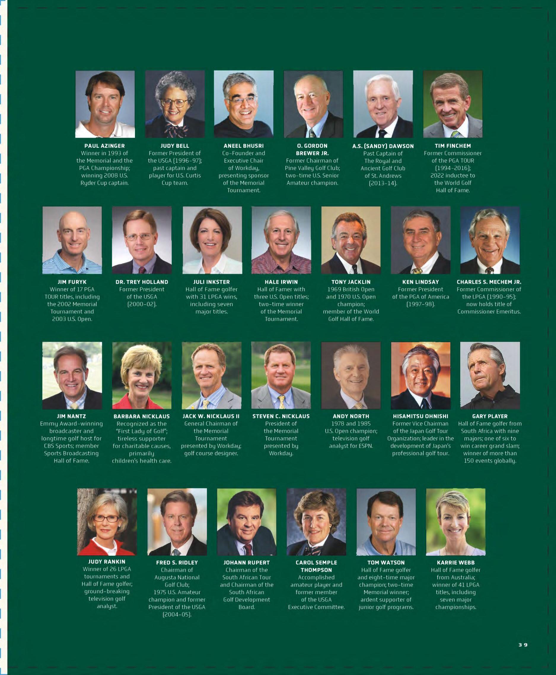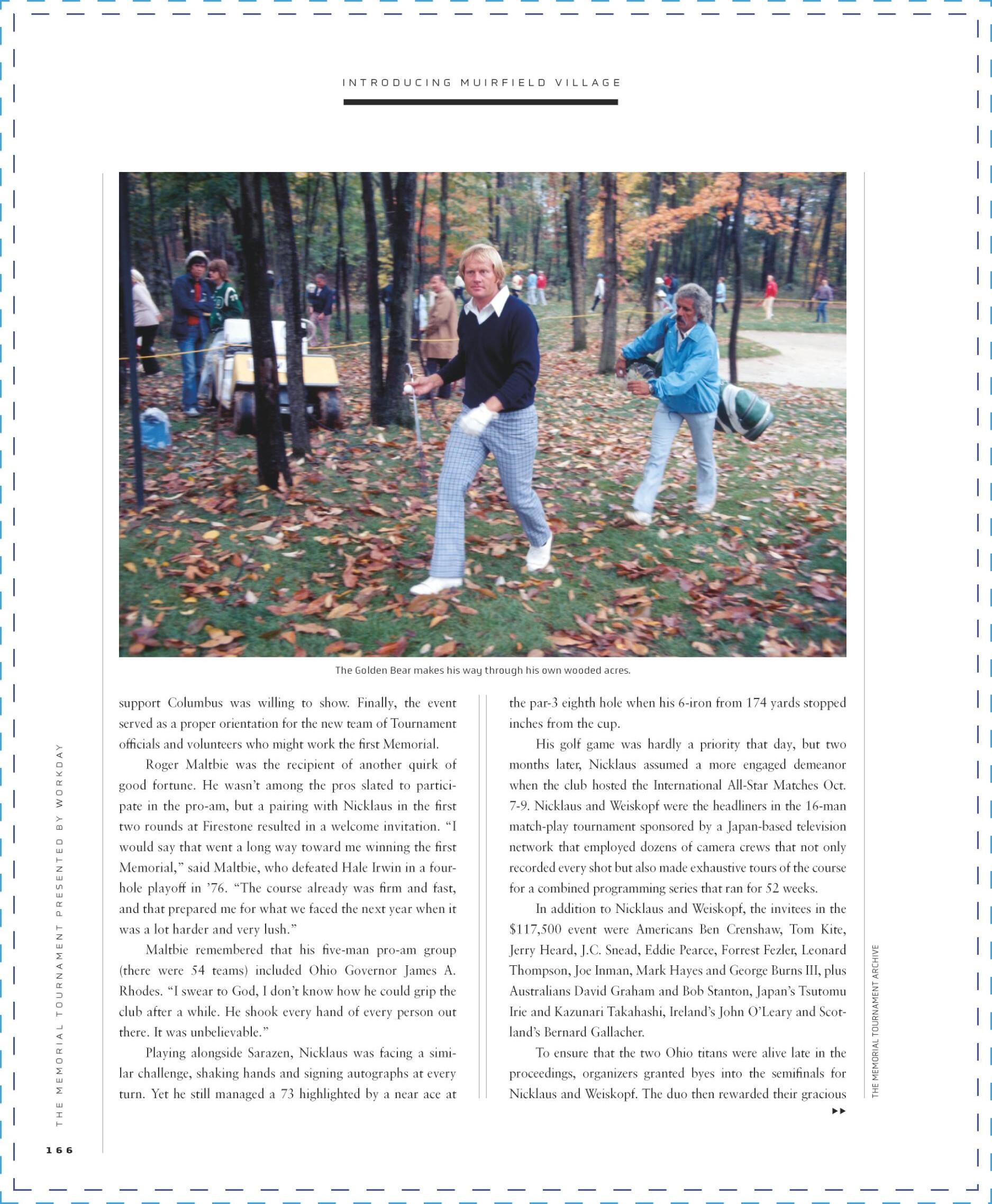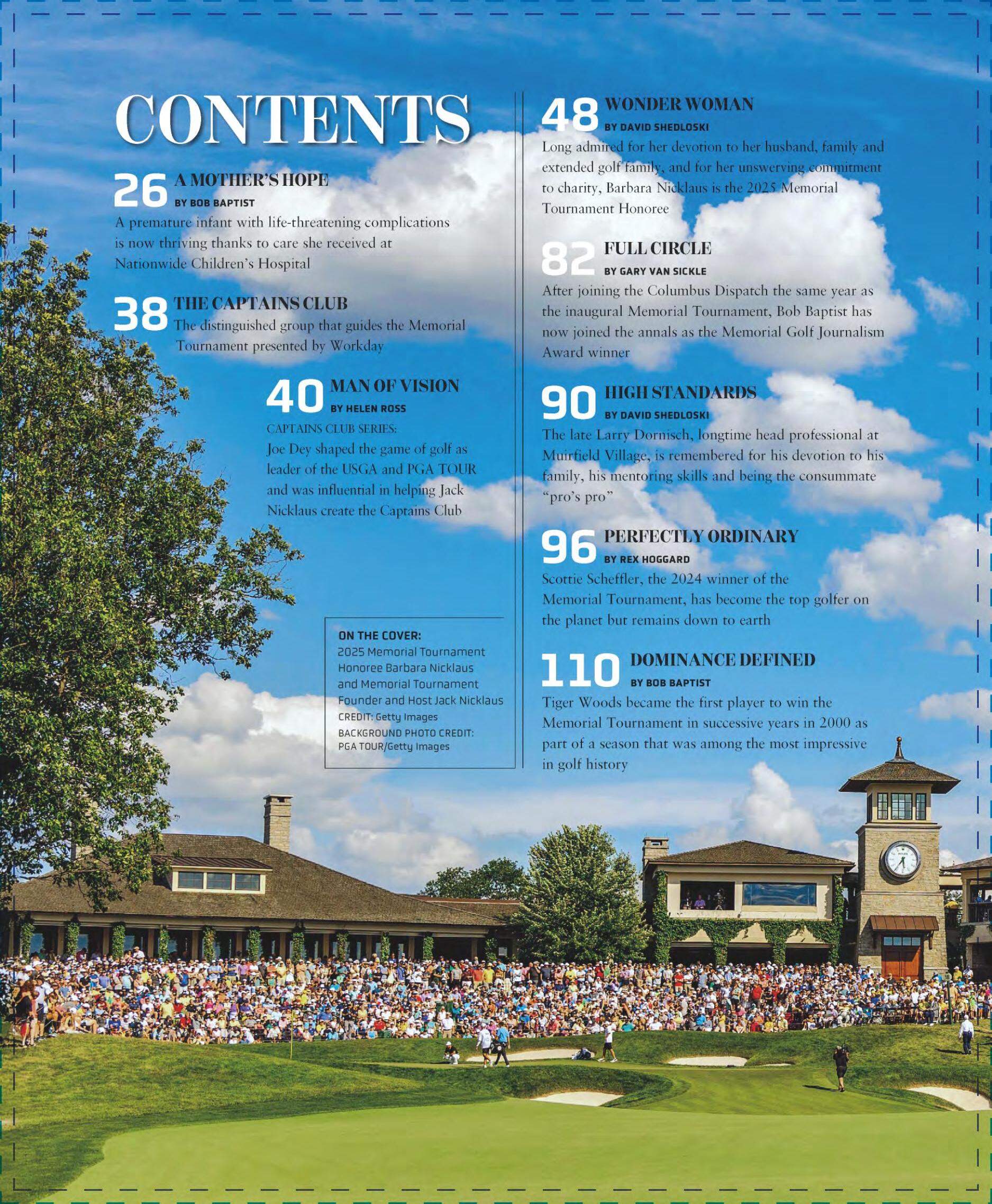 Hosted annually at Muirfield Village Golf Club in Dublin, Ohio, a suburb of Columbus. The Tournament, founded and hosted by Jack Nicklaus, is conducted each year with three goals in mind: to honor the memory of individuals living and deceased who have distinguished themselves in the game of golf; to showcase the world’s best golfers competing on one of the most challenging venues in the world for the enjoyment of spectators; and to benefit many Greater Columbus Charities in alliance with the Nicklaus Children's Healthcare Foundation, Nationwide Children's Hospital, Eat. Learn. Play. Foundation and numerous other local organizations.