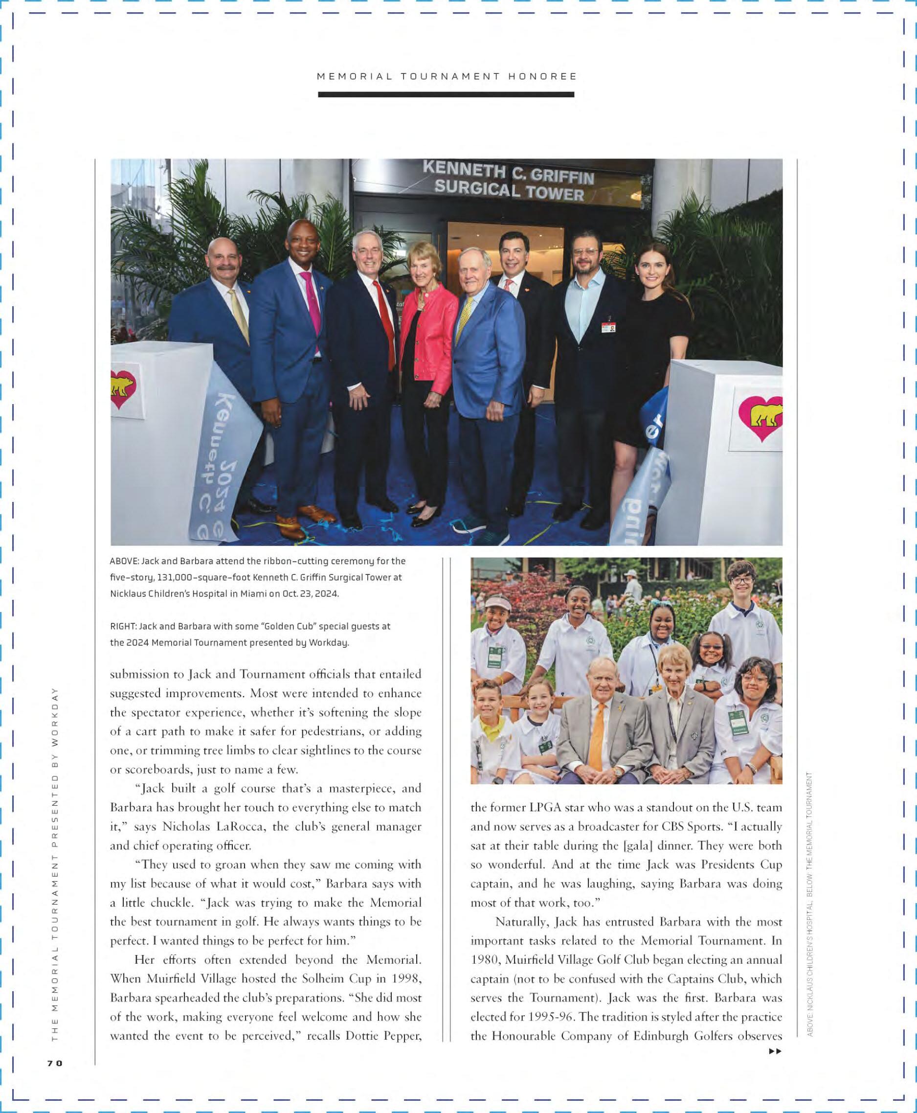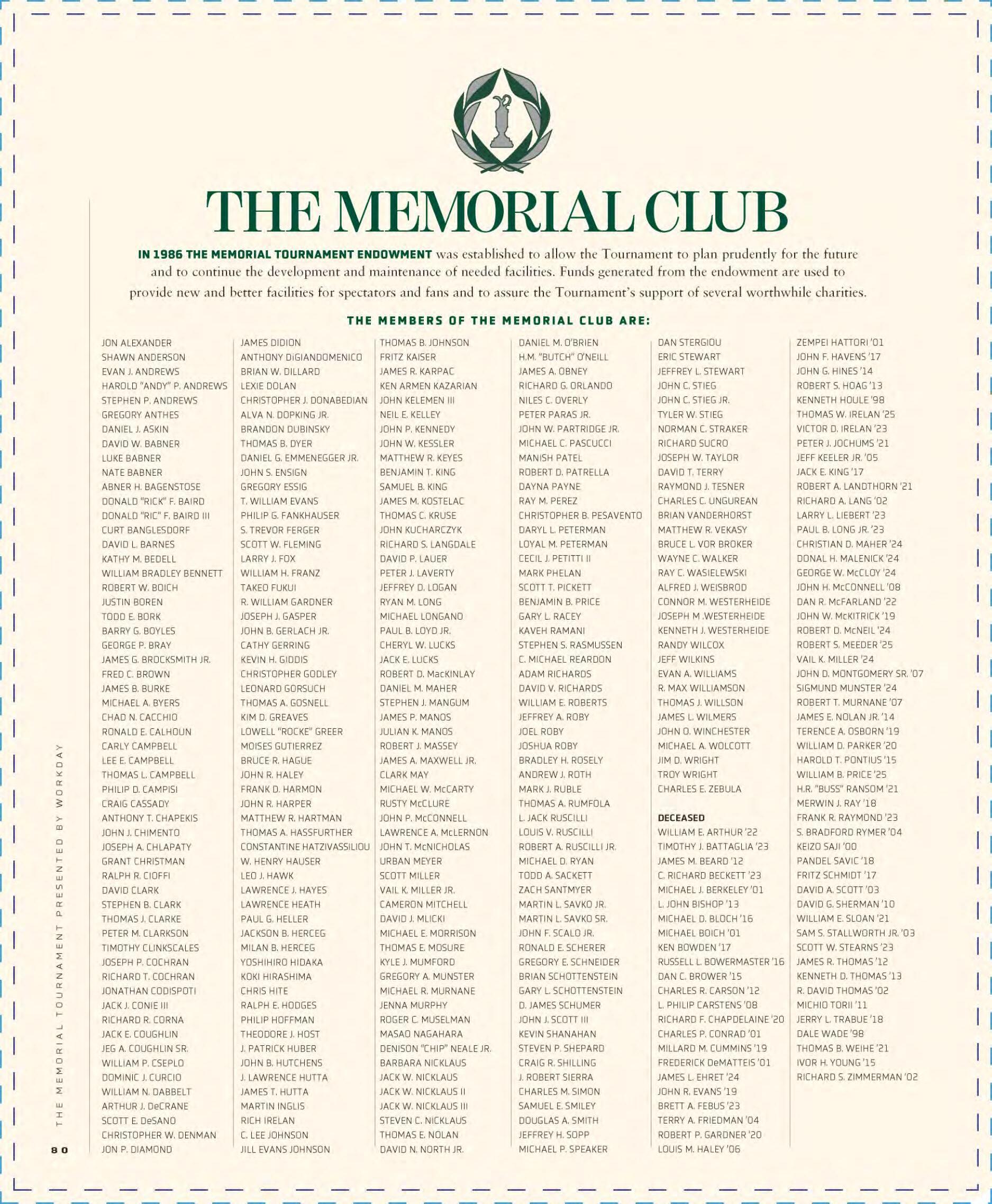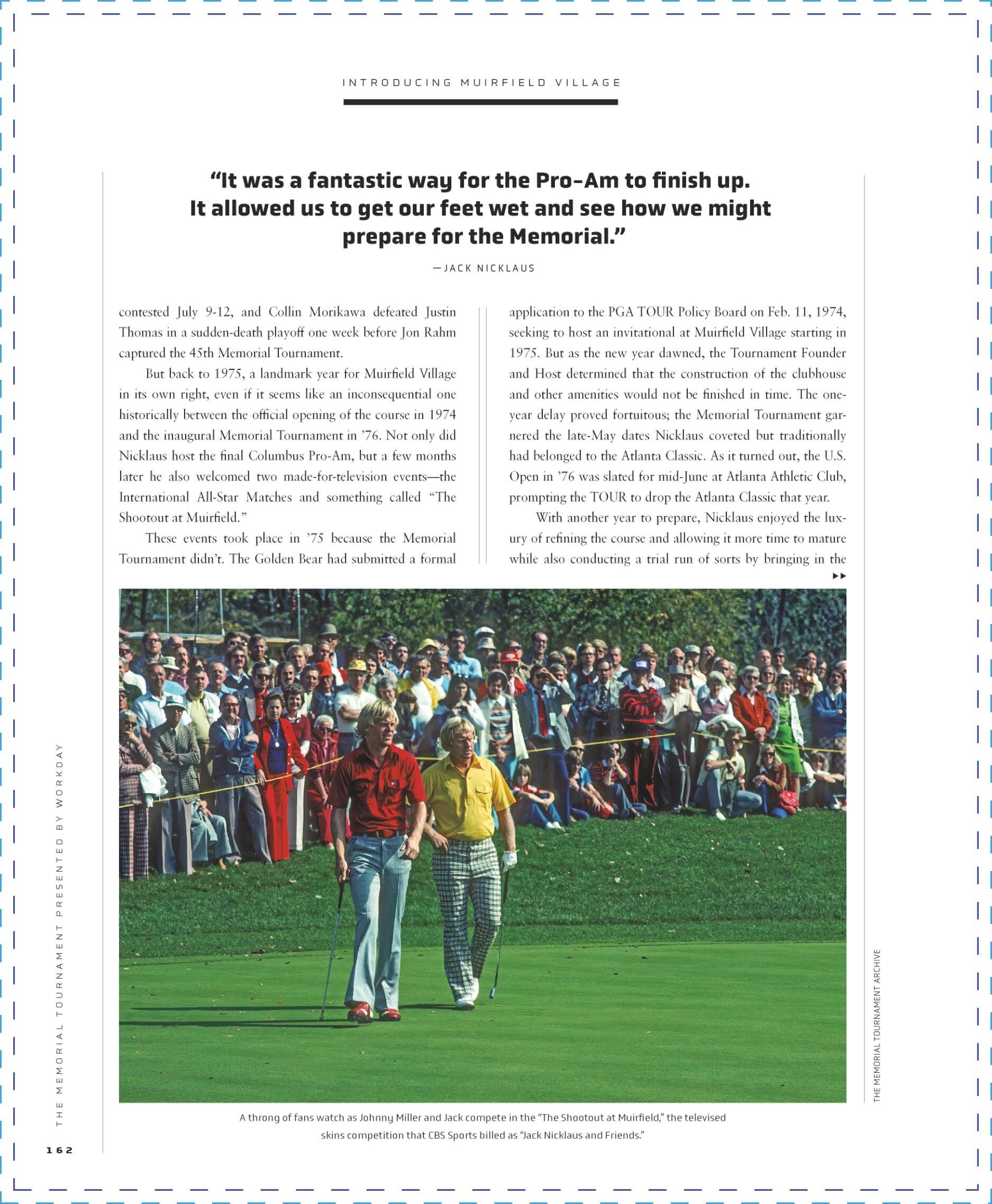 Hosted annually at Muirfield Village Golf Club in Dublin, Ohio, a suburb of Columbus. The Tournament, founded and hosted by Jack Nicklaus, is conducted each year with three goals in mind: to honor the memory of individuals living and deceased who have distinguished themselves in the game of golf; to showcase the world’s best golfers competing on one of the most challenging venues in the world for the enjoyment of spectators; and to benefit many Greater Columbus Charities in alliance with the Nicklaus Children's Healthcare Foundation, Nationwide Children's Hospital, Eat. Learn. Play. Foundation and numerous other local organizations.