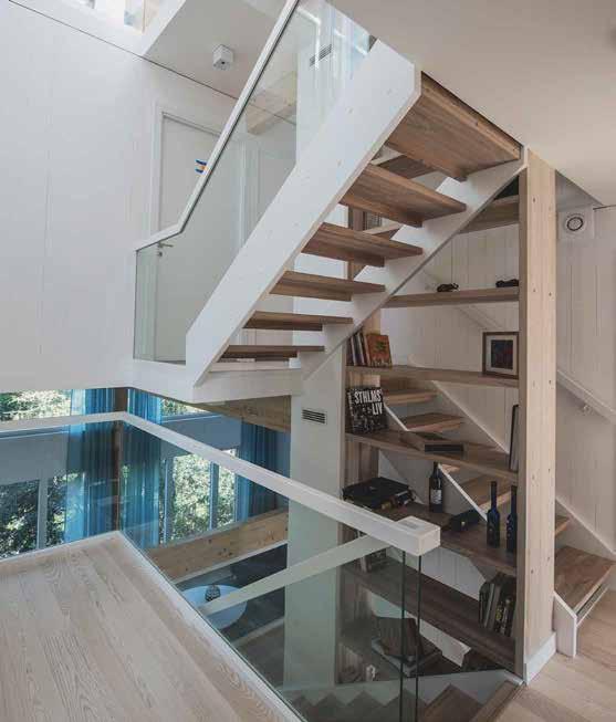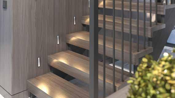 L-shaped staircase features an open-step design with 80mm thick treads, o ering a modern and spacious aesthetic. The metal balusters provide structural support enhancing the staircase's contemporary look. A standout feature is the specially designed handrail, beautifully illuminated by integrated LED lighting, adding both functionality and style