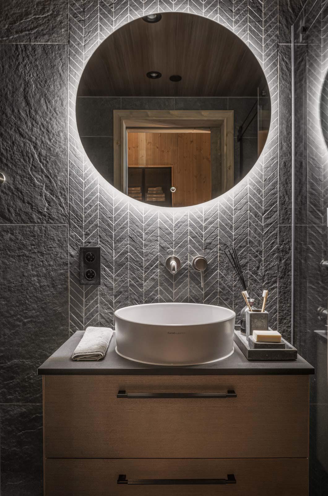 The bathrooms in Svartskard are a testament to modern aesthetics. Large tiles are accompanied with smaller mosaic, both in the same matte, natural slate stone. The round shaped wash basin and mirror, and the wooden décor gives a contemporary yet elegant look.