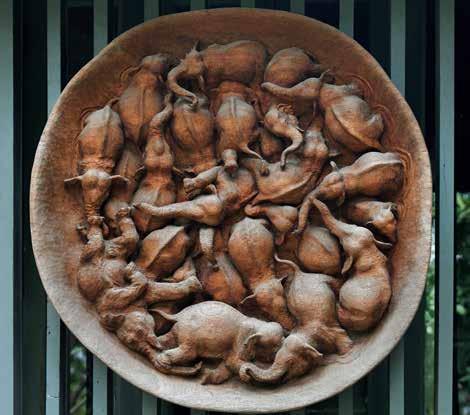 who were both originally from the San Kamphaeng district. At that time, most woodcraftsmen in the village were producing carvings of individual elephants in similar poses. These were sold and became known as a local Chiang Mai craft. During that time, I had to travel to Chiang Mai regularly for various reasons, and I often met up with the pair until we developed a close friendship. Many times, I traveled with an engineer friend who shared my interest in wood carvings. As we became more familiar with the craftsmen, we large and small elephants, carve elephants in various poses such as standing, crouching, sitting, or laying down. I also suggested the the spirit of northern Thai elephants. They took our advice and produced some beautiful pieces. Many people showed an interest in produced carvings of individual elephants, my engineer friend and I suggested they try their hand at carving herd of elephants in a each piece. This was time consuming and not cost effective. I also felt it was a pity that so much of the wood ended up being carved close friends, I felt comfortable enough to suggest that they carve just half of the slab, leaving sections of it intact to display the natural of the woodcarvings of these two craftsmen in this volume.
