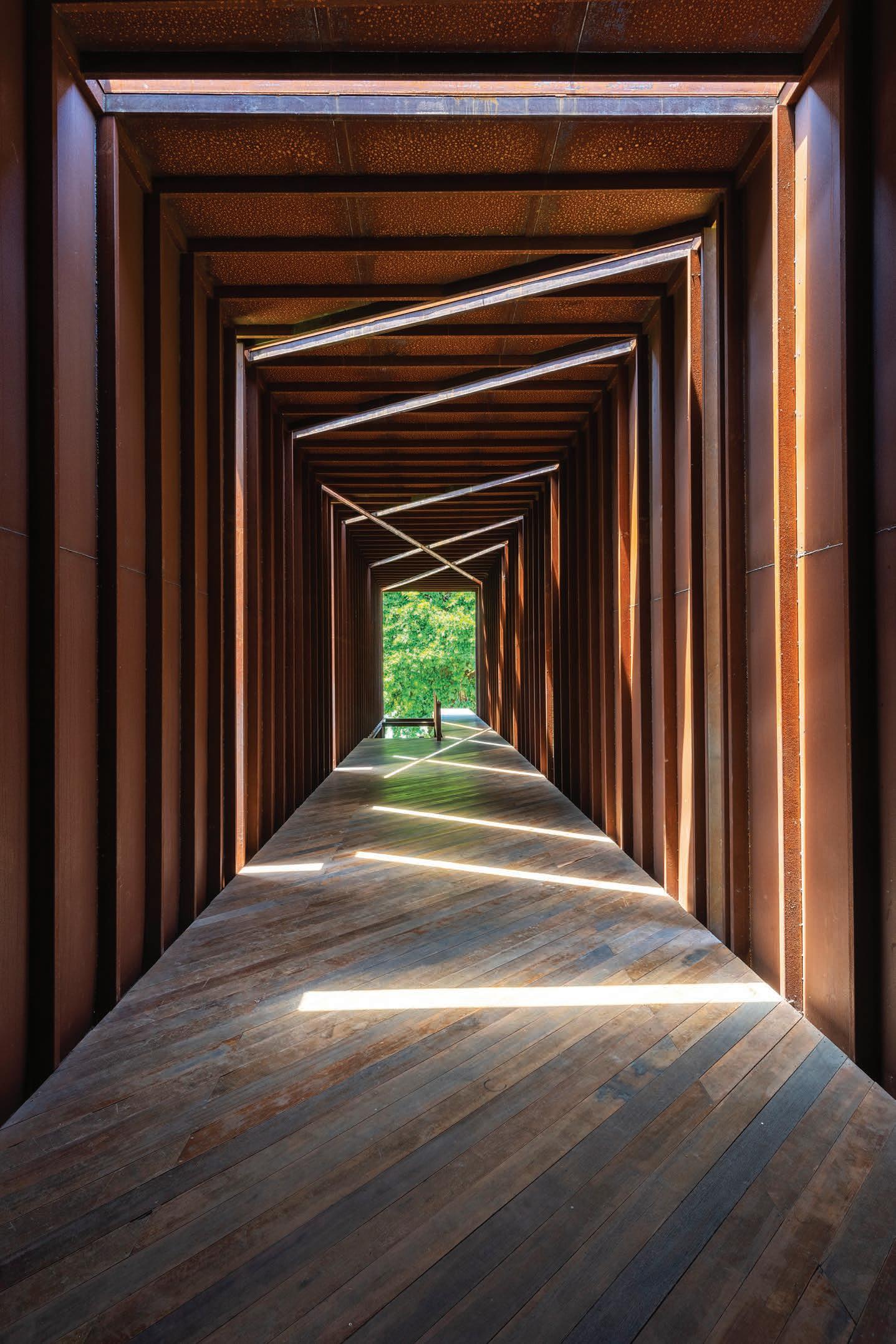 The structure serves as a tunnel to minimize the fact that the floor is on different levels and acts as a walkway towards the river. The focus shifts towards the enormous tree that disguises the view of the river. This is where the tunnel comes into play. Its main objective is to increase distance and depth using both material and light, allowing the concept of time to fall into place.