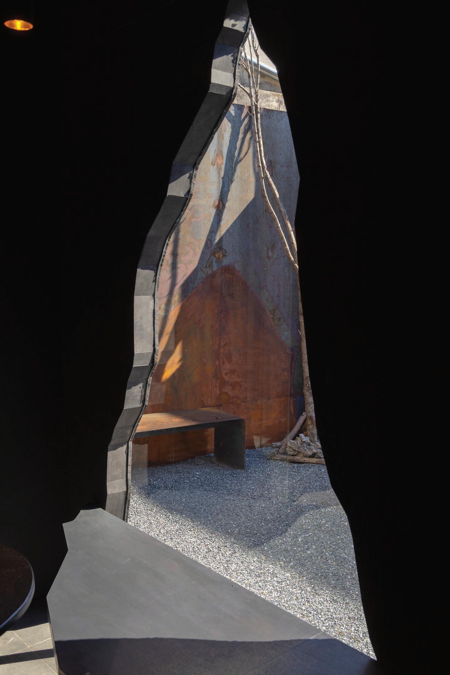 The use of metal materials for extensions involved various techniques, including blackening, texture painting, and intentional rusting. The outdoor space in front of the building features metal walls of varying thicknesses, with some left to rust over time to enhance the natural look and intricate graphics of the façade. Seats are deliberately crafted from cut steel derived from window openings. The outdoor hall area serves as a landscaping space for temporary displays, allowing for versatile presentations depending on the season.