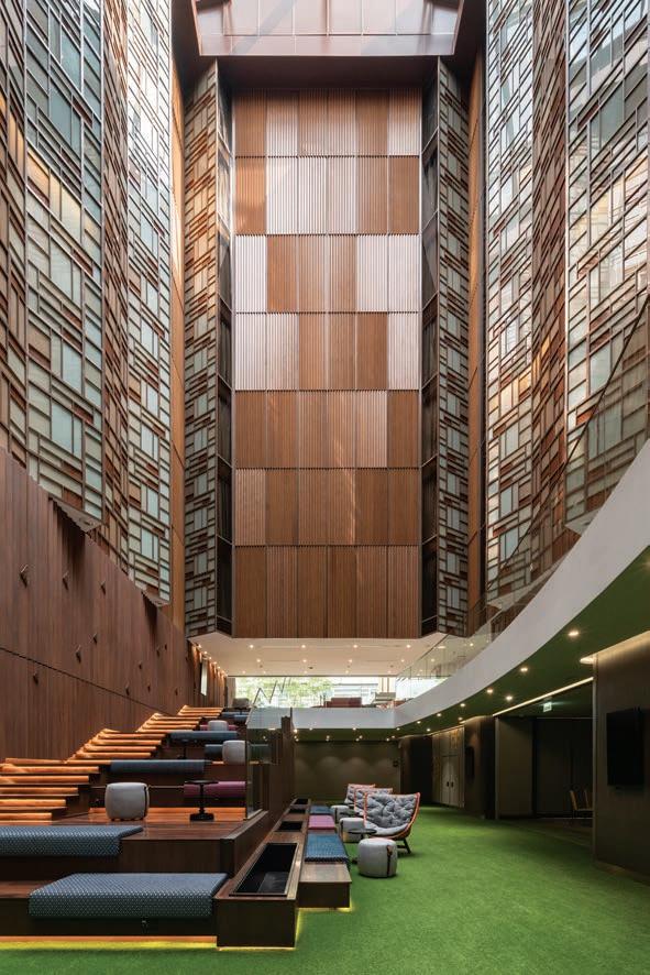 The atrium, strategically positioned to provide captivating views of the inner guestrooms, features a fully open skylight roof. Natural sunlight cascades down, infusing the space with warmth and creating a mesmerizing play of light and shadow. The atrium also houses a pre-function area in the basement, enhancing the guest experience and captivating their senses.