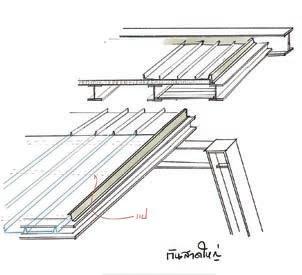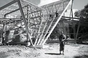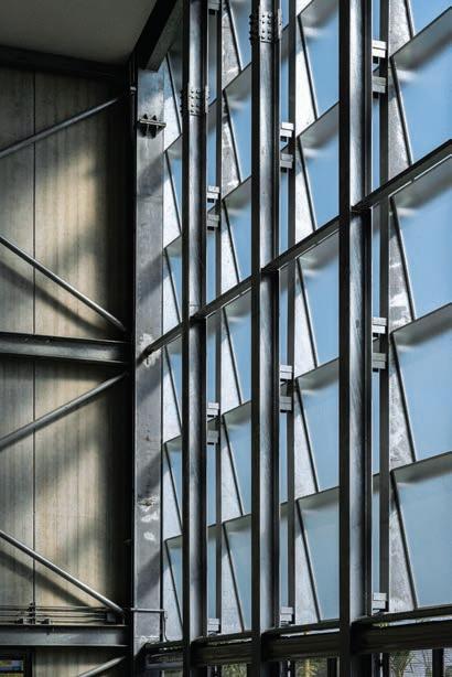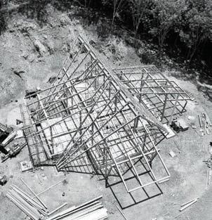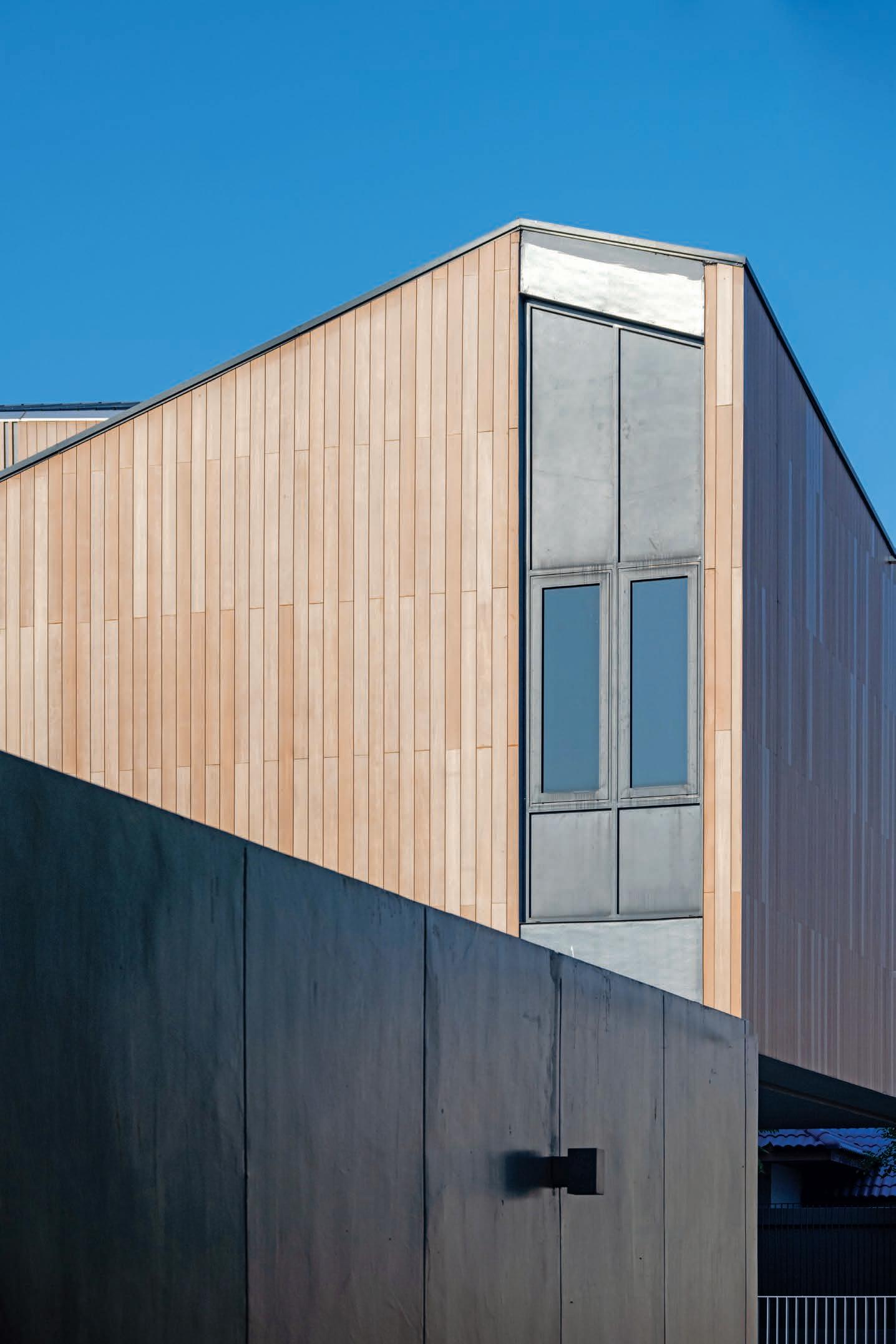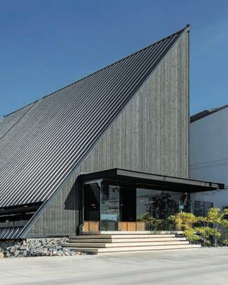homes. Steel roof beams, sharp rafters with pointed ends supported by steel pipes, combined with glass, aluminum grills, wood, zinc, and concrete, brought the shed roof shape back into vogue and has evolved ever since in residences and various types of buildings.