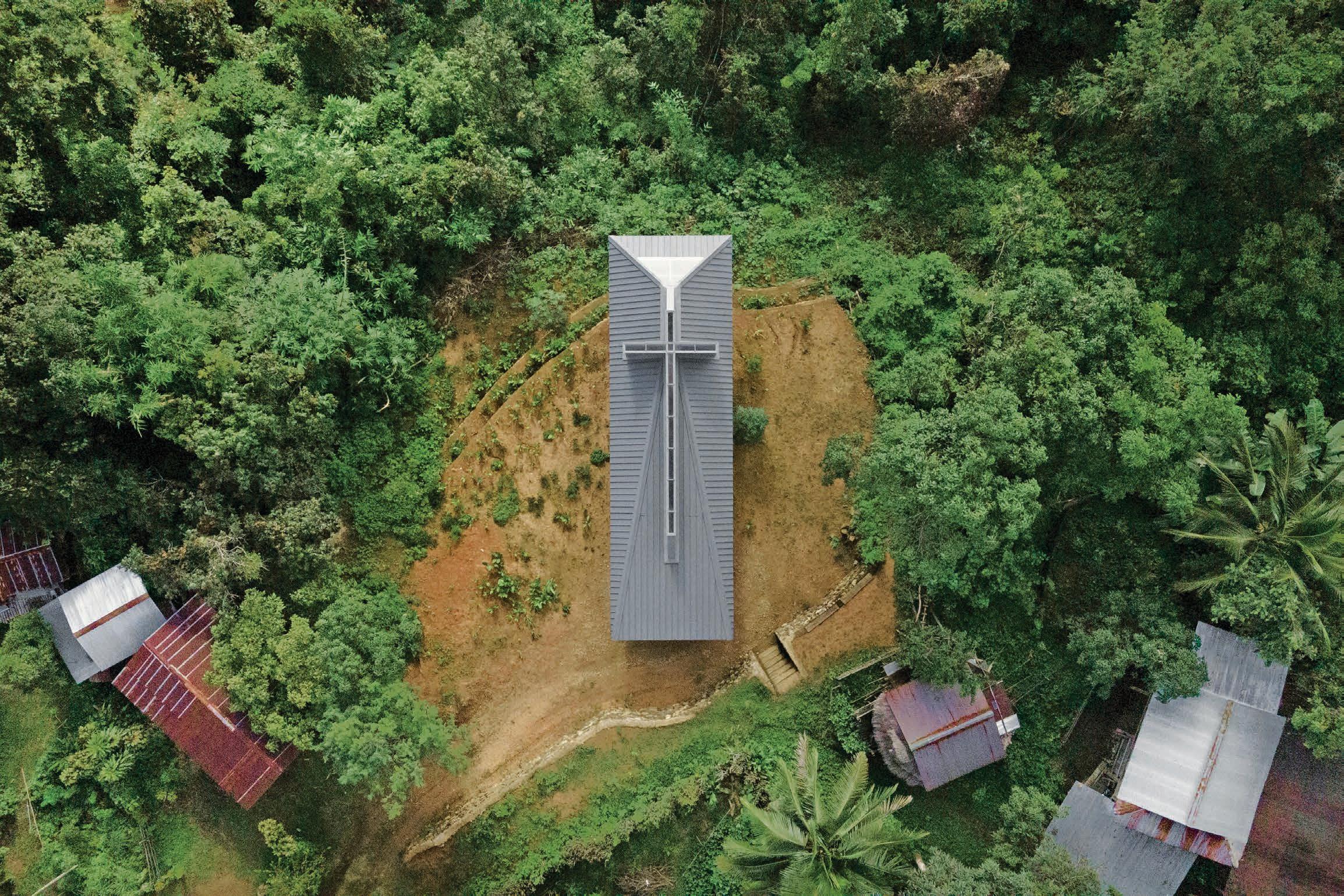 The chapel design was inspired by observing the behaviors and houses of the villagers, aiming to create a structure that harmonizes with the site and the local community. The design incorporates features reminiscent of the villagers’ timber houses, which are elevated to facilitate airflow underneath. Long openings near the floor promote cross ventilation and diffuse daylight. Emphasizing the significance of light in creating a transcendent experience for visitors in remembrance of God, the architects drew inspiration from the cross, a fundamental Christian symbol.