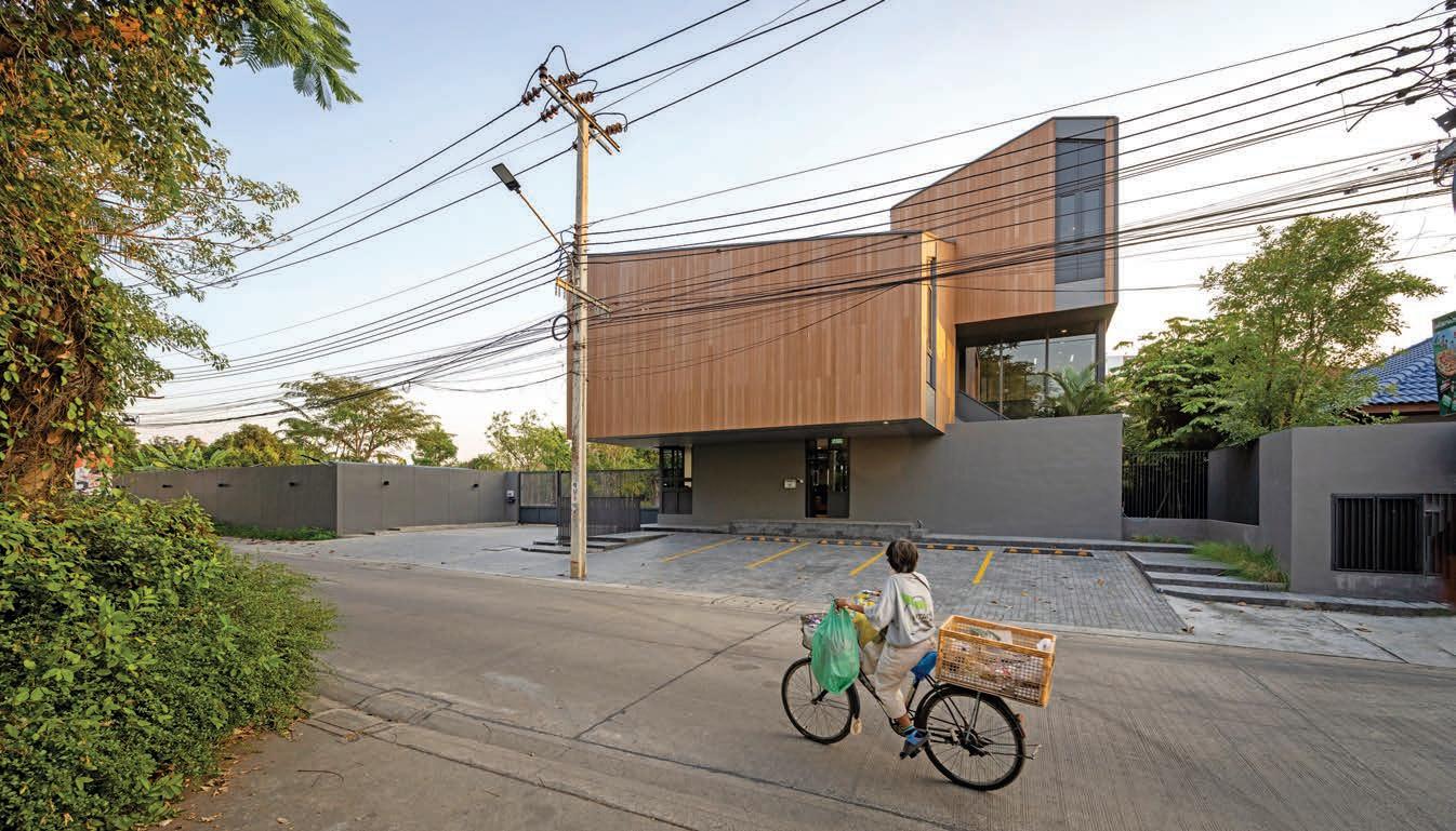 PLACE: All programs are strategically situated on the site. The office area is positioned at the front of the site, near the main road, with the second floor cantilevered to create a prominent entrance and cover the front parking area. The living area is centrally located, and the warehouse is situated at the back of the site.