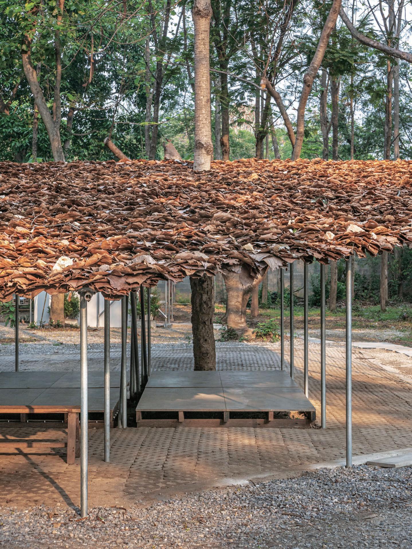The simple building comprises an inclined roof made of layered leaves supported by a steel pipe grid frame and elevated platforms. The leaves are sourced from trees native to Northern Thailand and need replacement every 4-5 years. For centuries, locals have gathered these fallen leaves, using them to make utensils, roofs, and walls for their homes. This tradition helps prevent frequent forest fires during the dry season. All components of the building, including the structure, are constructed entirely through the repetition of commonly found materials and assembled by hand. Despite its seemingly temporary nature, the entire structure can be regenerated by replacing individual parts and materials as needed.