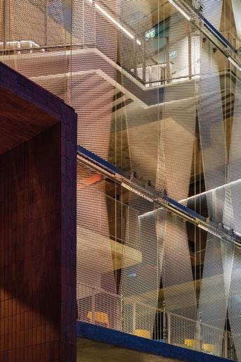 A parametrically designed mesh partition, utilizing a fundamental attractor’s algorithm, stands between both spaces. The façade serves as a partition, keeping both sides separate, with only specific areas open for interaction. 9-millimeter steel rods are intricately woven into 22 different types of butterfly-shaped panels. The weave and panel sizes are systematically organized and applied to the façade algorithmically. Panels near the openings are larger, with their holes creating more connection and interaction with the public second floor, while those located further away feel denser and more private.