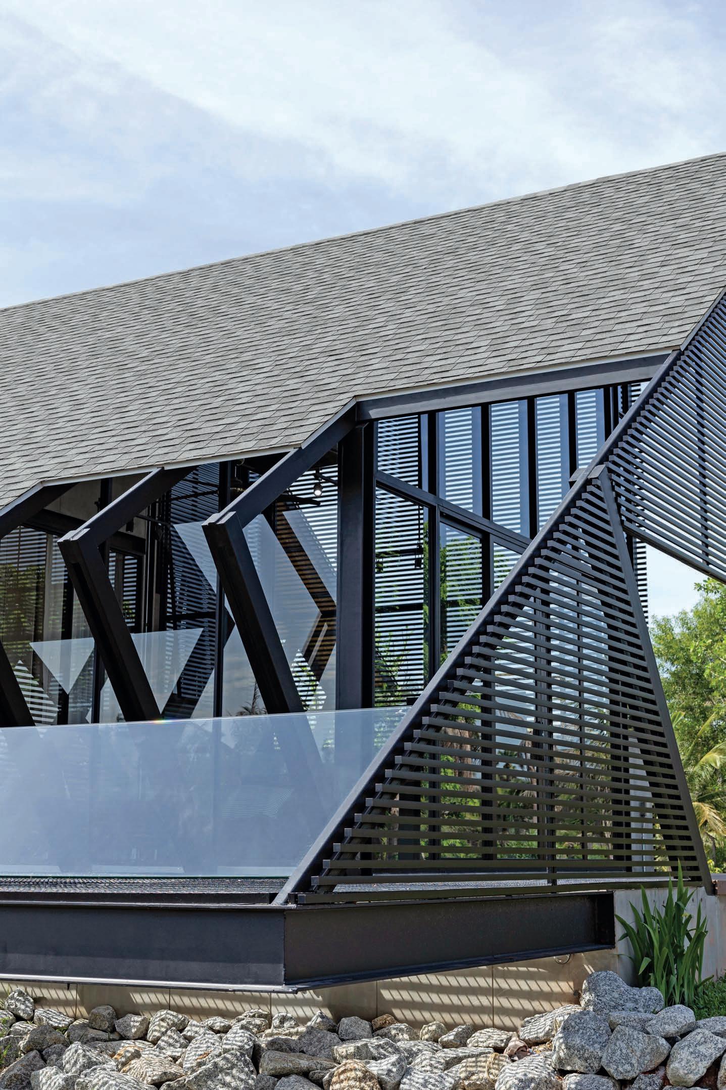 The villa incorporates several sustainable features and practices, aligning with principles of eco-friendly design. The use of recycled materials is evident in the utilization of used steel sourced from an old warehouse owned by the villa’s owner. Additionally, aluminum trellises are employed for durability and low maintenance. The open-plan living space is designed for multipurpose use, accommodating family gatherings, dining, and even extending into sleeping areas.