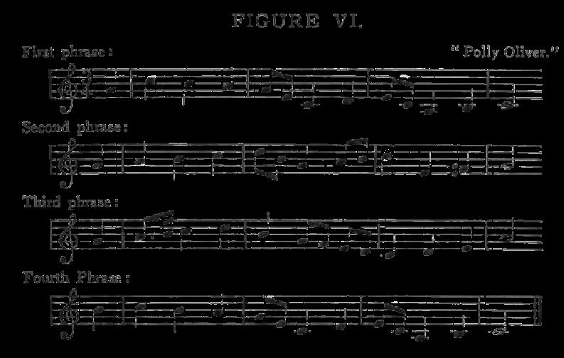 Another fiddler’s tune of unknown origin, but which will not soon disappear, is “The Arkansas Traveler.” The tune and the tale which accompanies it are true bits of American folk-lore. The tune began to be very popular among fiddlers about 1850. According to the story, a happy-go-lucky, improvident Arkansas farmer sits in front of his cabin playing the first strain of the air. Up rides a stranger in search of a night’s lodging, who endeavors to engage him in conversation, saying, “Why don’t you put a roof on your house?” The squatter, who keeps on fiddling, answers, “When it’s dry I don’t want a roof; when it’s wet I can’t,” and so on — much more of the same sort. The stranger finally asks the fiddler why he doesn’t play the second half of the tune. The squatter replies: “I’ve knowed that tune ten years, and it ’ain’t got no second part.” “Give me the fiddle,” says the stranger, who, after fiddling through the familiar first strain of the tune, turns off into the second part with the heel-tingling skill of the true jigplayer. Instantly the whole scene changes. The farmer jumps to his feet, swinging arms and dancing, the children tumble about, and the delighted host sings out: “Walk in, stranger. Tie up your horse side of ol’ Bill. Give him ten ears of corn. Pull out the demijohn and drink it all,” with many other expressions of homely and enthusiastic welcome.